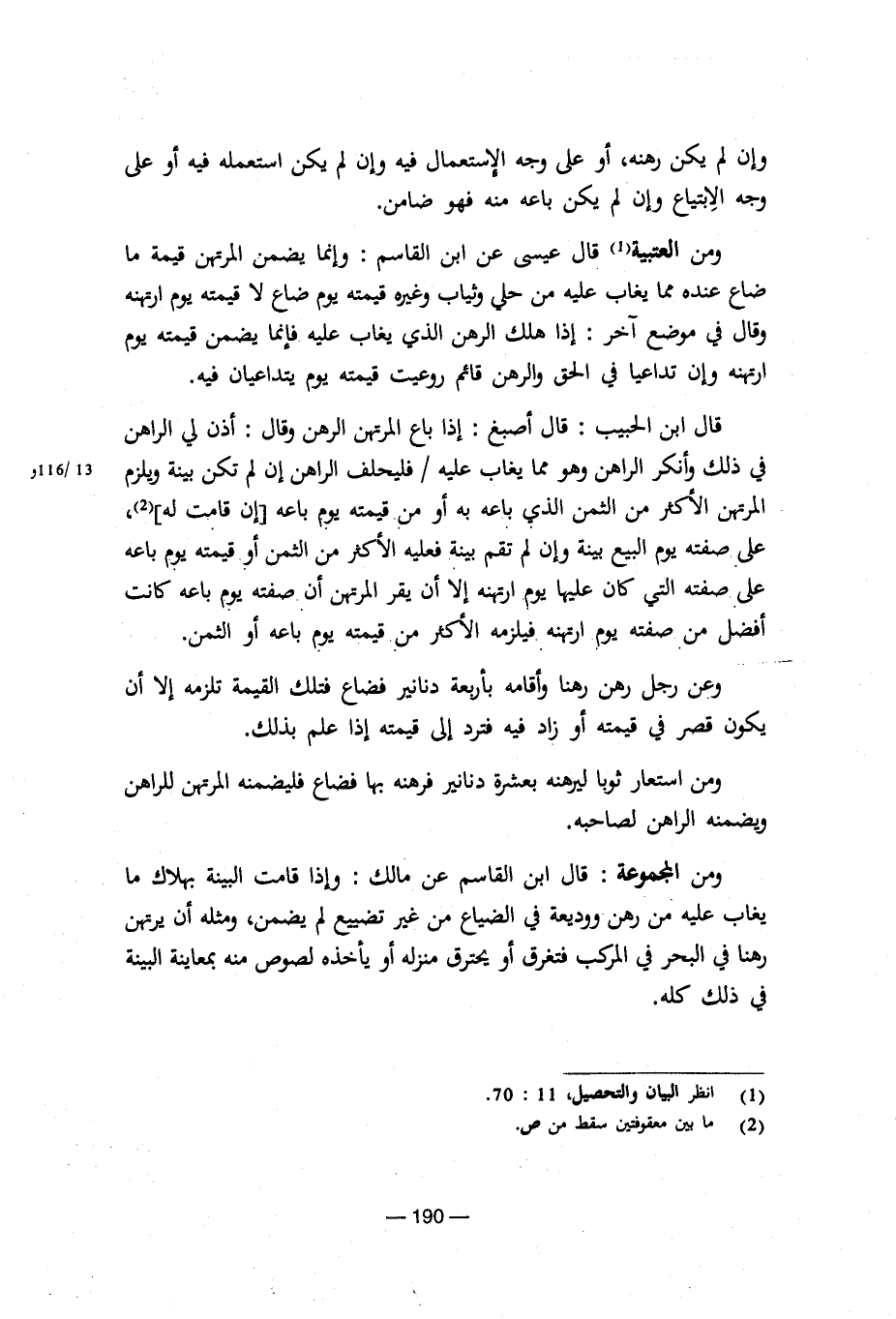ومن المجموعة: قال ابن القاسم عن مالك: وإذا قامت البينة بهلاك ما يغاب عليه من رهن ووديعة في الضياع من غير تضييع لم يضمن، ومثله أن يرتهن رهنا في البحر في المركب فتغرق أو يحترق منزله أو يأخذه لصوص منه بمعاينة البينة في ذلك كله.