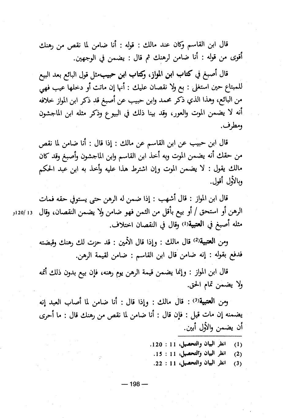 ومن العتبية: قال مالك: وإذا قال: أنا ضامن لما أصاب العبد إنه يضمنه إن مات قيل: فإن قال: أنا ضامن لما نقص من رهنك قال: ما أحرى أن يضمن والأول أبين.