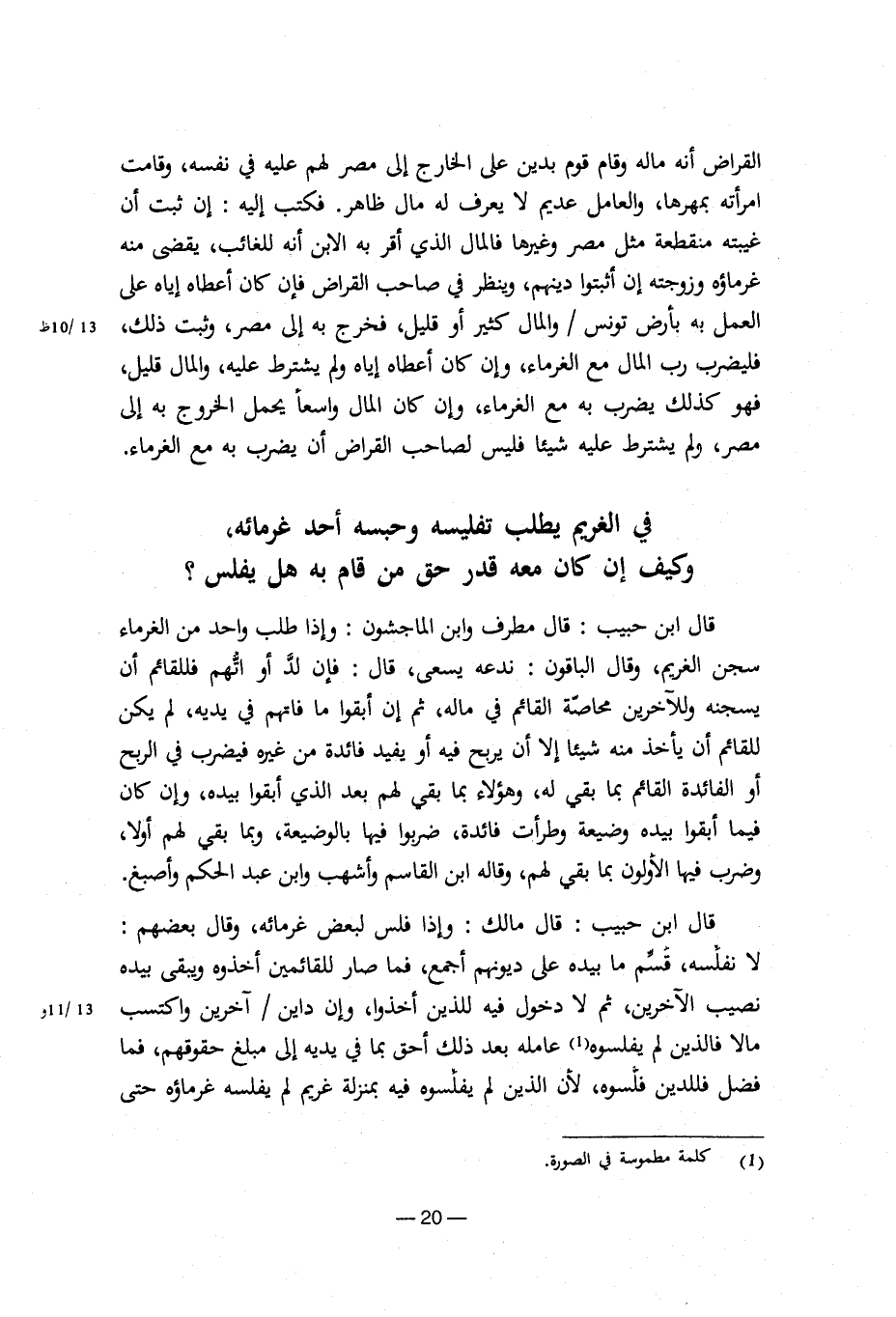 القراض أنه ماله وقام قوم بدين على الخارج إلى مصر لهم عليه في نفسه، وقامت امرأته بمهرها، والعامل عديم لا يعرف له مال ظاهر، فكتب إليه. إن ثبت أن غيبته منقطعة مثل مصر وغيرها فالمال الذي أقر به الابن أنه للغائب، يقضي منه غرماؤه وزوجته إن أثبتوا دينهم، وينظر في صاحب القراض فإن كان أعطاه إياه على العمل به بأرض تونس/والمال كثير أو قليل، فخرج به إلى مصر، وثبت ذلك، فليضرب رب المال مع الغرماء، وإن كان أعطاه إياه ولم يشترط عليه، والمال قليل فهو كذلك يضرب به مع الغرماء، وإن كان المال واسعا يحمل الخروج به إلى مصر، ولم يشترط عليه شيئا فليس لصاحب القراض أن يضرب به مع الغرماء.