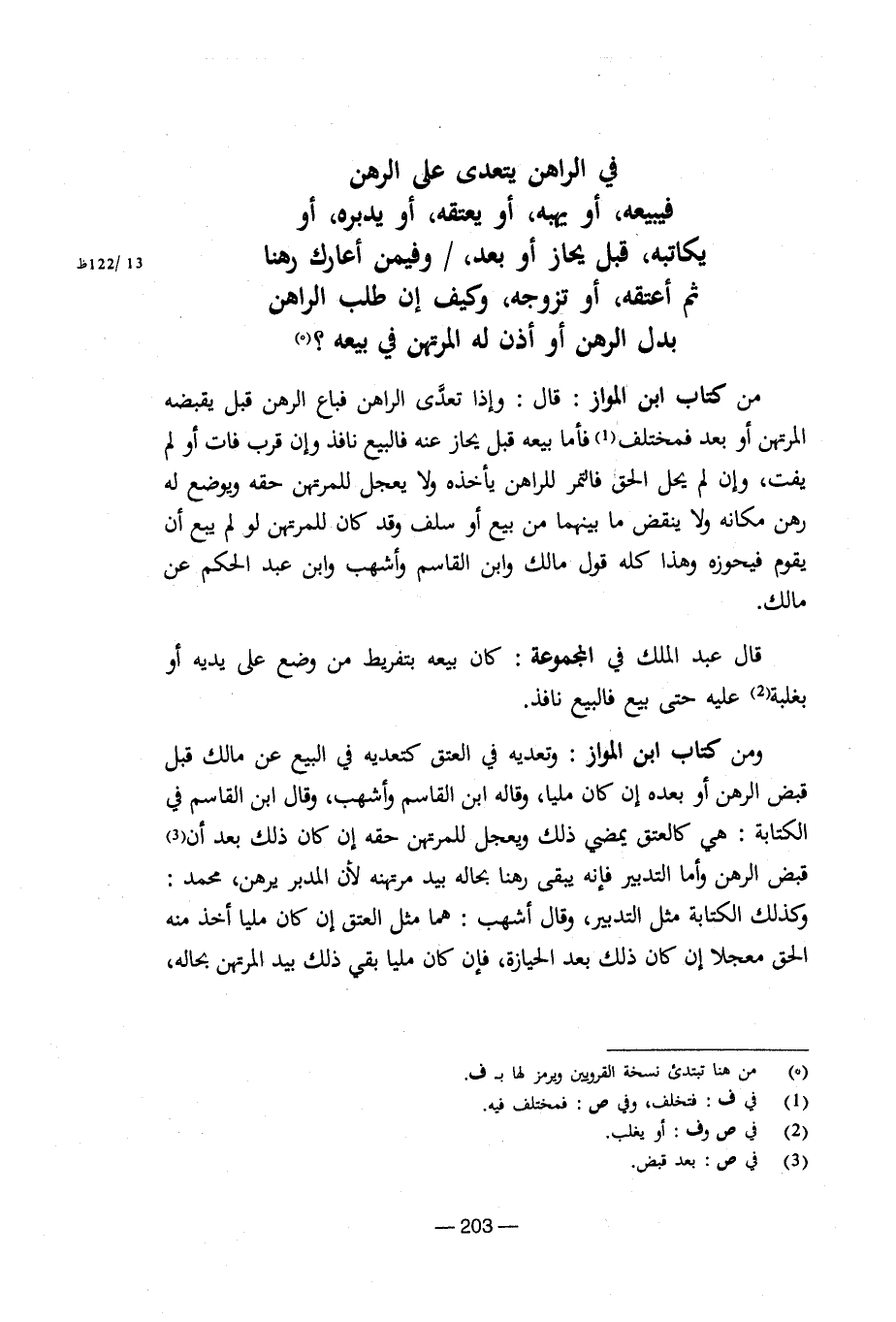 ومن كتاب ابن المواز: وتعديه في العتق كتعديه في البيع عن مالك قبل قبض الرهن أو بعده إن كان مليا، وقاله ابن القاسم وأشهب، وقال ابن القاسم في الكتابة: هي كالعتق يمضي ذلك ويعجل للمرتهن حقه إن كان بعد أن قبض الرهن وأما التدبير فإنه يبقى رهنا بحاله بيد مرتهنه لأن المدبر يرهن، محمد: وكذلك الكتابة مثل التدبير، وقال أشهب: هما مثل العتق إن كان مليا أخذ منه الحق معجلا إن كان ذلك بعد الحيازة، فإن كان مليا بقي ذلك بيد المرتهن بحاله،