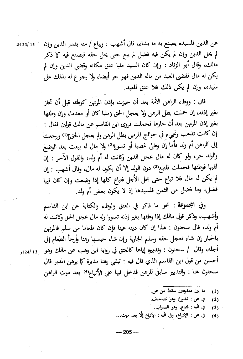 وفي المجموعة: نحو ما ذكر في العتق والوطء والكتابة عن ابن القاسم وأشهب، وذكر قول مالك إذا وطئها بغير إذنه تسورا وله مال عجل الحق وكانت له أم ولد، قال سحنون: هذا إن كان دينه عينا فإن كان طعاما من سلم فالمرتهن بالخيار إن شاء تعجل حقه وسلم الجارية وإن شاء حبسها رهنا وأرجا الطعام إلى أجله، وقال/سحنون: وتدبيره إياها كالعتق في رواية ابن وهب عن مالك وهو أحسن من قول ابن القاسم الذي قال فيه: تبقي مدبرة كما يرهن المدبر قال سحنون هنا: والتدبير سابق للرهن فدخل فيها على الأتباع بعد موت الراهن