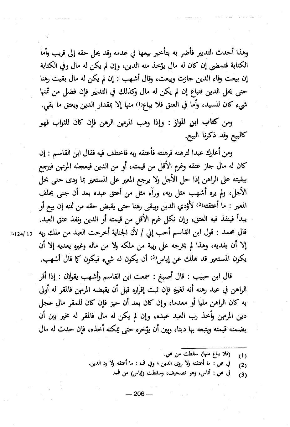 وهذا أحدث التدبير فأضر به بتأخير بيعها في عدمه وقد يحل حقه إلى قريب وأما الكتابة فتمضى إن كان له مال يؤخذ منه الدين، وإن لم يكن له مال وفي الكتابة إن بيعت وفاء الدين جازت وبيعت، وقال أشهب: إن لم يكن له مال بقيت رهنا حتى يحل الدين فتباع إن لم يكن له مال وكذلك في التدبير فإن فضل من ثمنها شيء كان للسيد، وأما في العتق فلا يباع منها إلا بمقدار الدين ويعتق ما بقي.