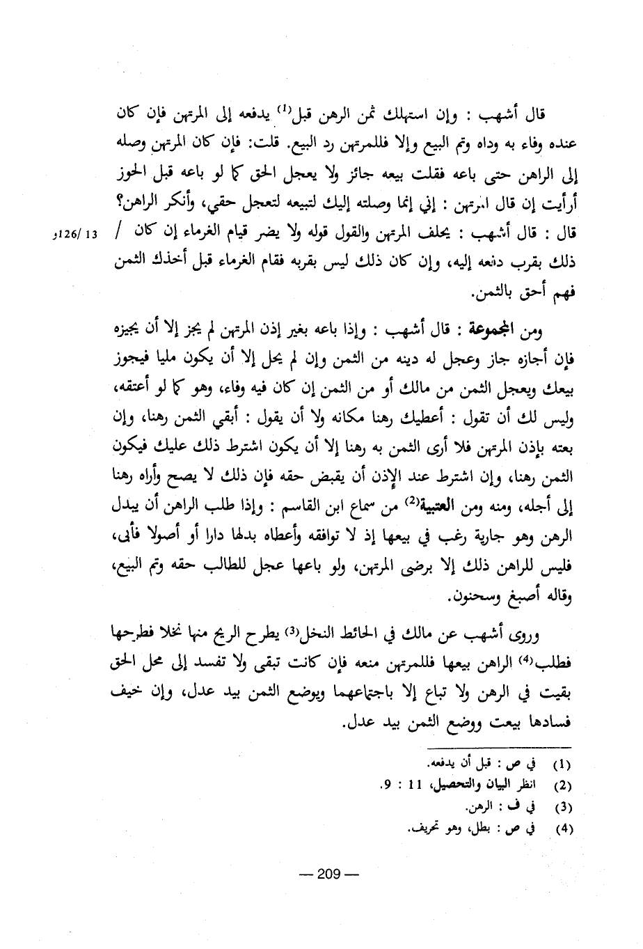 ومن المجموعة: قال أشهب: وإذا باعه بغير إذن المرتهن لم يجز إلا أن يجيزه فإن أجازه جاز وعجل له دينه من الثمن وإن لم يحل إلا أن يكون مليا فيجوز بيعك ويعجل الثمن من مالك أو من الثمن إن كان فيه وفاء، وهو كما لو أعتقه، وليس لك أن تقول: أعطيك رهنا مكانه ولا أن يقول: أبقي الثمن رهنا، وإن بعته بإذن المرتهن فلا أرى الثمن به رهنا إلا أن يكون اشترط ذلك عليك فيكون الثمن رهنا، وإن اشترط عند الإذن أن يقبض حقه فإن ذلك لا يصح وأراه رهنا إلى أجله، ومنه ومن العتبية من سماع ابن القاسم: وإذا طلب الراهن أن يبدل الرهن وهو جارية رغب في بيعها إذ لا توافقه وأعطاه بدلها دارا أو أصولا فأبى، فليس للراهن ذلك إلا برضي المرتهن، ولو باعها عجل للطالب حقه وتم البيع، وقاله اصبغ وسحنون.