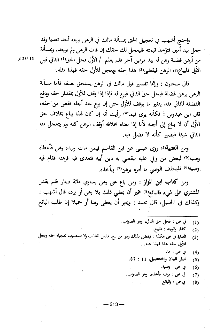 واحتج أشهب في تعجيل الحق بمسألة مالك في الرهن يبيعه تعديا وقد جعل بيد أمين فتؤخذ قيمته فليعجل لك حقك إن فات الرهن ولم يوجد، وبمسألة من أرهن فضلة رهن له بيد مرتهن آخر فلم يعلم/الأول فحل الحق الثاني قبل الأول فليباع الرهن فيقضى هذا حقه ويعجل للأول حقه فهذا مثله.