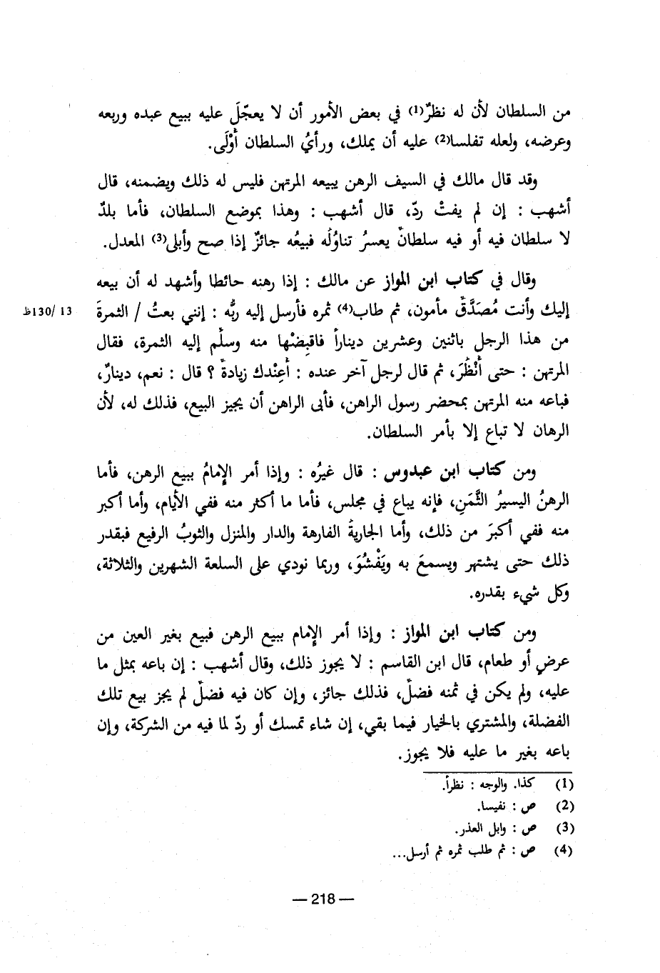ومن كتاب ابن عبدوس: قال غيره: إذا أمر الإمام ببيع الرهن، فأما الرهن اليسير الثمن، فإنه يباع في مجلس، فأما ما أكثر منه ففي الأيام، وأما أكبر منه ففي أكبر من ذلك، وأما الجارية الفارهة والدار والمنزل والثوب الرفيع فبقدر ذلك حتى يشتهر ويسمع به ويفشو، وربما نودي على السلعة الشهرين والثلاثة، وكل شيء بقدره.