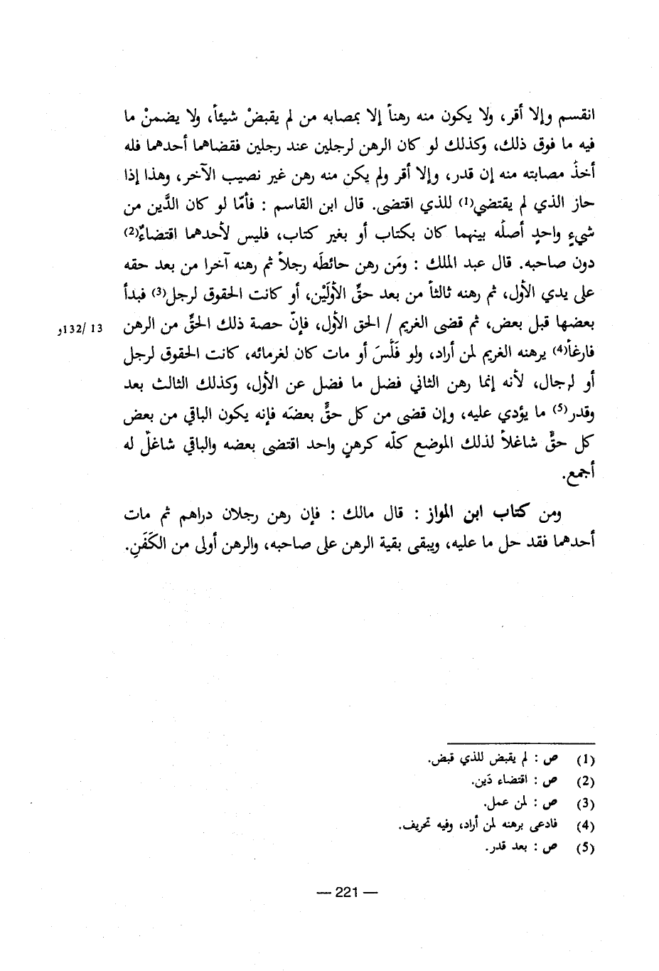 ومن كتاب ابن المواز: قال مالك: فإن رهن رجلان دراهم ثم مات أحدهما فقد حل ما عليه، ويبقى بقية الرهن على صاحبه، والرهن أولى من الكفن.