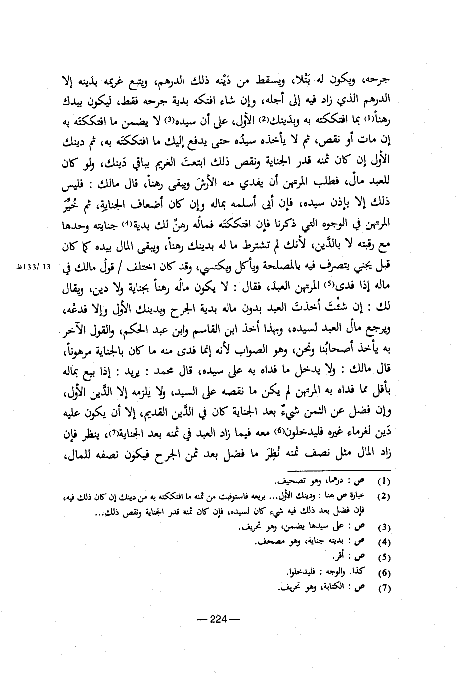 جرحه، ويكون له بتلا، ويسقط من دنه الدرهم، ويتبع غريمه بدينه إلا الدرهم الذي زاد فيه إلى أجله، وإن شاء افتكه بدية جرحه فقط، ليكون بيدك رهنا بما اتفككته به وبدينك الأول، على أن سيده لا يضمن ما افتككته به إن مات أو نقص، ثم لا يأخذه سيده حتى يدفع إليك ما افتككته به، ثم دينك الأول إن كان ثمنه قدر الجناية ونقص ذلك ابتعت الغريم بباقي دينك، ولو كان للعبد مال، فطلب المرتهن أن يفدي منه الأرش ويبقى رهنا، قال مالك: فليس ذلك إلا بإذن سيده، فإن أبى اسمله بماله وإن كان أضعاف الجناية، ثم خير المرتهن في الوجوه التي ذكرنا فإن افتككته فماله رهن لك بدية جنايته وحدها مع رقبته لا بالدين، لأنك لم تشترط ما له بدينك رهنا، ويبقى المال بيده كما كان قبل يجني يتصرف فيه بالمصلحة ويأكل ويكتسي، وقد كان اختلف/قول مالك في ماله إذا فدى المرتهن العبد، فقال: لا يكون ماله رهنا بجناية ولا دين، ويقال لك: إن شئت أخذت العبد بدون ماله بدية الجرح وبدينك الأول وإلا فدعه، ويرجع مال العبد لسيده، وبهذا أخذ ابن القاسم وابن عبد الحكم، والقول الآخر به يأخذ أصحابنا ونحن، وهو الصواب لأنه إنما فدى منه ما كان بالجناية مرهونا، قال مالك: ولا يدخل ما فداه به على سيده، قال محمد: يريد: إذا بيع بماله بأقل مما فداه به المرتهن لم يكن ما نقصه على السيد، ولا يلزمه إلا الدين الأول، وإن فضل عن الثمن شيء بعد الجناية كان في الدين القديم، إلا أن يكون عليه دين لغرماء غيره فليدخلون معه فيما زاد العبد في ثمنه بعد الجناية ينظر فإن زاد المال مثل نصف ثمنه نظر ما فضل بعد ثمن الجرح فيكون نصفه للمال،