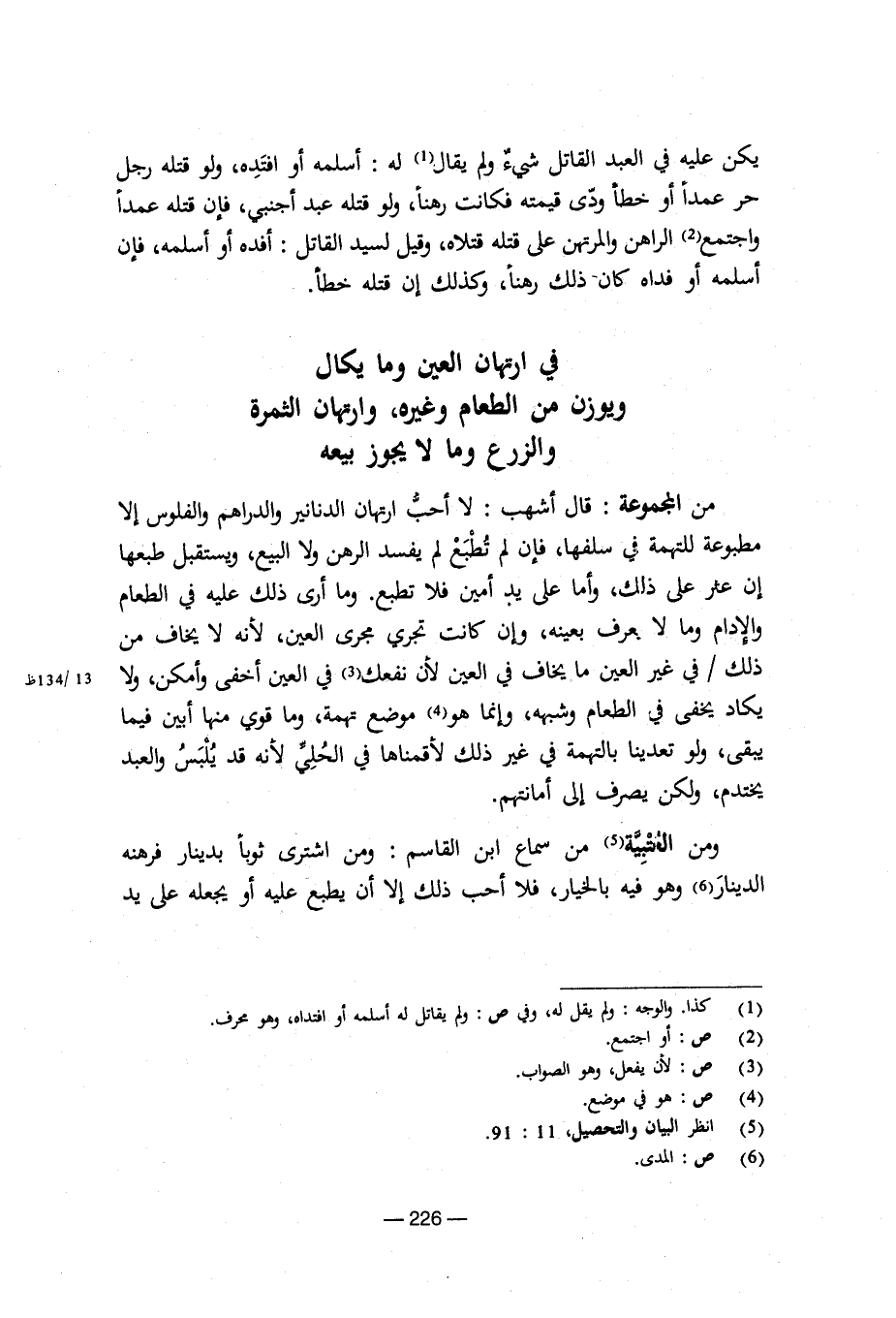 من المجموعة: قال أشهب: لا أحب ارتهان الدنانير والدراهم والفلوس إلا مطبوعة للتهمة ف سلقها، فإن لم تطيع لم يفسد الرهن ولا البيع، ويستقبل طبعها إن عثر على ذلك، وأما على يد أمين فلا تطبع. وما أرى ذلك عليه في الطعام والإدام وما لا يعرف بعينه، وإن كانت تجري مجرى العين، لأنه لا يخاف من ذلك/في غير العين ما يخاف في العين لأن تفعك في العين أخفي وأمكن، ولا يكاد يخفي في الطعام وشبهه، وإنما هو موضع تهمة، وما قوي منها أبين فيما بيقى، ولو تعدينا بالتهمة في غير ذلك لأقمناها في الحلي لأنه قد يلبس والعيد يختدم، ولكن يصرف إلى أمانتهم.