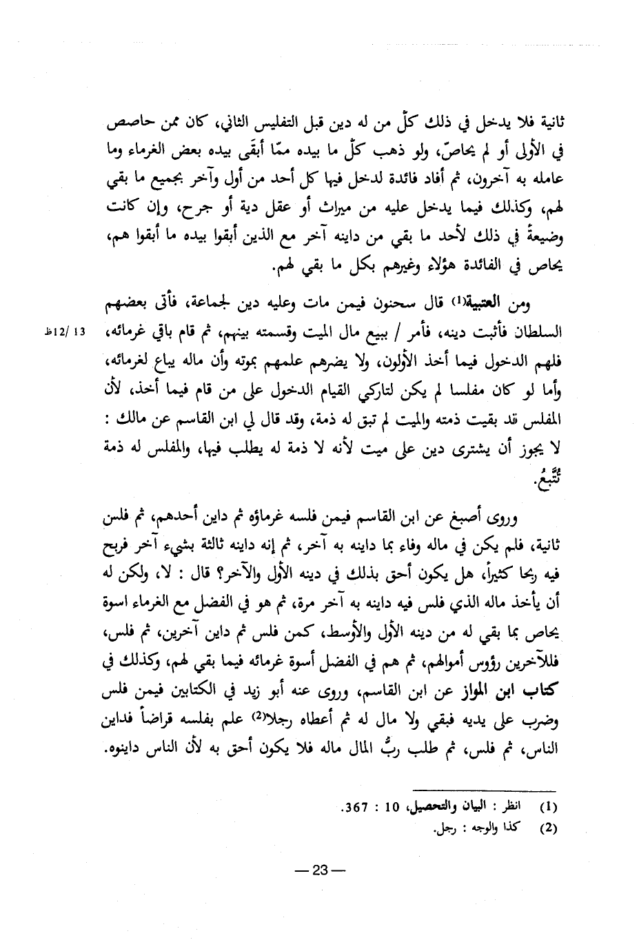 ثانية فلا يدخل في ذلك كل من له دين قبل التفليس الثاني، كان ممن حاصص في الأولى أو لم يحاص، ولو ذهب كل ما بيده مما أبقى بيده بعض الغرماء وما عامله به آخرون، ثم أفاد فائدة لدخل فيها كل أحد من أول وآخر بجميع ما بقى لهم، وكذلك فيما يدخل عليه من ميراث أو عقل دية أو جرح، وإن كانت وضيعة في ذلك لأحد ما بقى من داينه آخر مع الذين أبقوا بيده ما أبقوا هم، يحاص في الفائدة هؤلاء وغيرهم بكل ما بقى لهم.