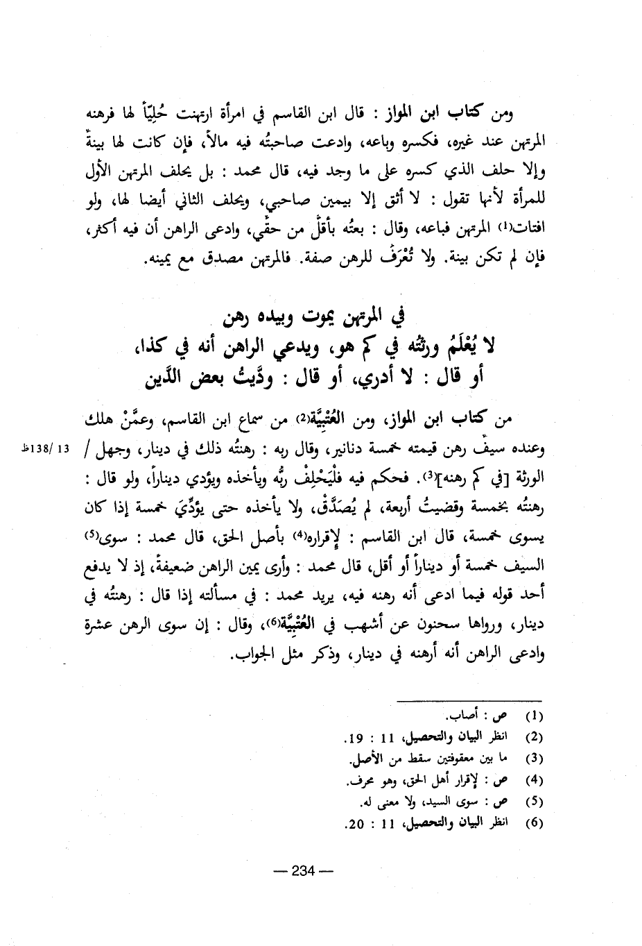 من كتاب ابن المواز، ومن العتبية من سماع ابن القاسم، وعمن هلك وعنده سيف رهن قيمته خمسة دنانير، وقال ربه: وهنته ذلك في دينارا، ولو قال: رهنته بخمسة وقضيت أربعة، لم يصدق، ولا يأخذه حتى يؤدي خمسة إذا كان يسوي خمسة، قال ابن القسم: لإقراره بأصل الحق، قال محمد: سوى السيف خمسة أو دينارا أو أقل، قال محمد: وأرى يمين الراهن ضعيفة، إذ لا يدفع أحد قوله فيما أدعى أنه رهنه فيه، يريد محمد: في مسألته إذا قال: رهنته في دينار، ورواها سحنون عن أشهب في العتبية، وقال: إن سوى الرهن عشرة وادعى الراهن أنه أرهنه في دينار، وذكر مثل الجواب.