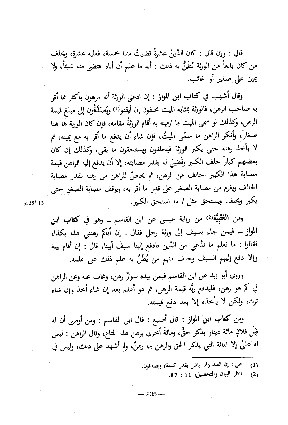 ومن العتبية من رواية عيسى عن ابن القاسم وهو في كتاب ابن المواز فيمن جاء بسيف إلى ورثة رجل فقال: إن أباكم رهنني هذا بكذا، فقالوا: ما نعلم ما تدعي من الدين فادفع إلينا سيف أبينا، قال: إن أقام بينة وإلا دفع إليهم السيف وحلف منهم من يظن به علم ذلك على علمه.