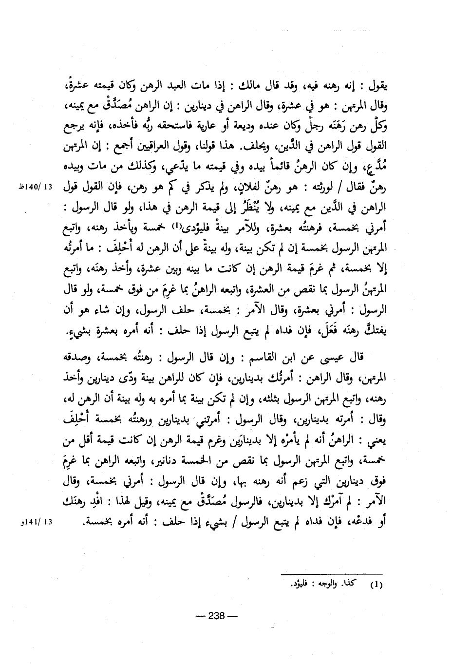 يقول: إنه رهنه فيه، وقد قال مالك: إذا مات العبد الرهن وكان قيمته عشرة، وقال المرتهن: هو في عشرة، وقال الراهن في دينارين: إن الراهن مصدق مع يمينه، وكل رهن رهنه رجل وكان عنده وديعة أو عارية فاستحقه ربه فأخذه، فإنه يرجع القول قول الراهن في الدين، يحلف. هذا قولنا، وقول العراقيين أجمع: إن المرتهن مدع، وإن كان الرهن قائما بيده وفي قيمته ما يدعى، وكذلك من مات وبيده رهن فقال/لورثته: هو رهن لفلان، ولم يذكر في كم هو رهن، فإن القول قول الراهن في الدين مع يمينه، ولا ينظر إلى قيمة الرهن في هذا، ولو قال الرسول: أمرني بخمسة، فرهنته بعشرة، وللآمر بينة فليؤدى خمسة ويأخذ رهنه، واتبع المرتهن الرسول بخمسة إن لم تكن بينة، وله بينة على أن ارهن له أحلف: ما أمرته إلا بخمسة، ثم غرم قيمة الرهن إن كانت ما بينه وبين عشرة، وأخذ رهنه، واتبع المرتهن الرسول بما نقص من العشرة، واتبعه الراهن بما غرم من فوق خمسة، ولو قال الرسول: أمرني بعشرة، وقال الآمر: بخمسة، حلف الرسول، وإن شاء هو أن يفتك رهنه فعل، فإن فداه لم يتبع الرسول إذا حلف: أنه أمره بعشرة بشيء.