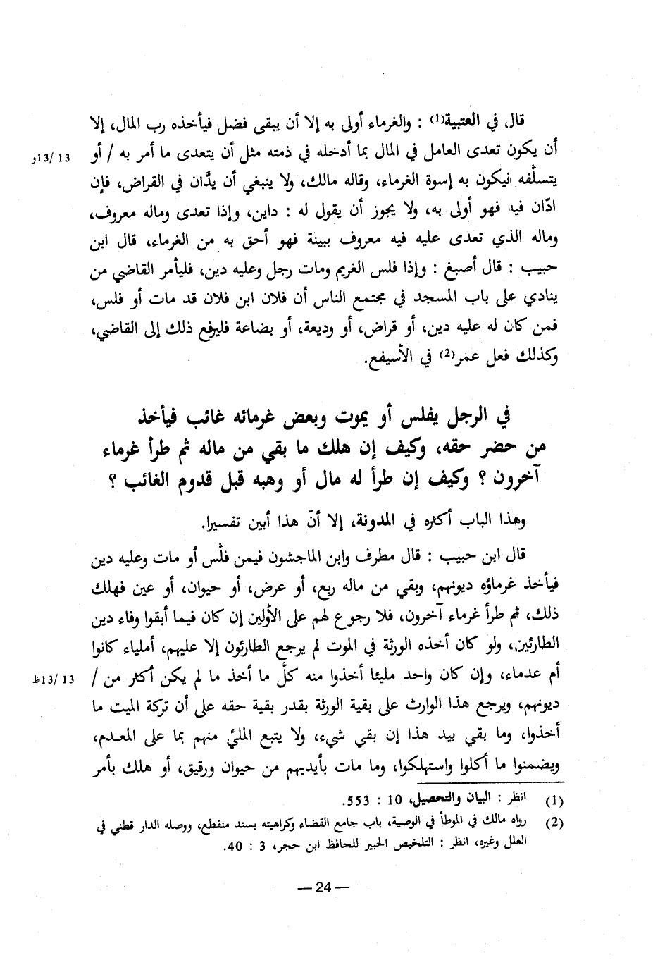 قال ابن حبيب: قال مطرف وابن الماجشون فيمن فلس أو مات وعليه دين فيأخذ غرماؤه ديونهم، وبقي من ماله ربع، أو عرض، أو حيوان، أو عين فهلك ذلك، ثم طرأ غرماء آخرون، فلا رجوع لهم على الأولين إن كان فيما أبقوا وفاء دين الطارئين، ولو كان أخذه الورثة في الموت لم يرجع الطارئون إلا عليهم، أملياء كانوا أم عدماء، وإن كان واحد مليئا أخذوا منه كل ما أخذ ما لم يكن أكثر من/ديونهم، ويرجع هذا الوارث على بقية الورثة بقدر حقه على أن تركة الميت ما أخذوا، وما بقى بيد هذا إن بقي شيء، ولا يتبع المليء منهم بما على المعدم، ويضمنوا ما أكلوا واستهلكوا، وما مات بأيديهم من حيوان ورقيق، أو هلك بأمر