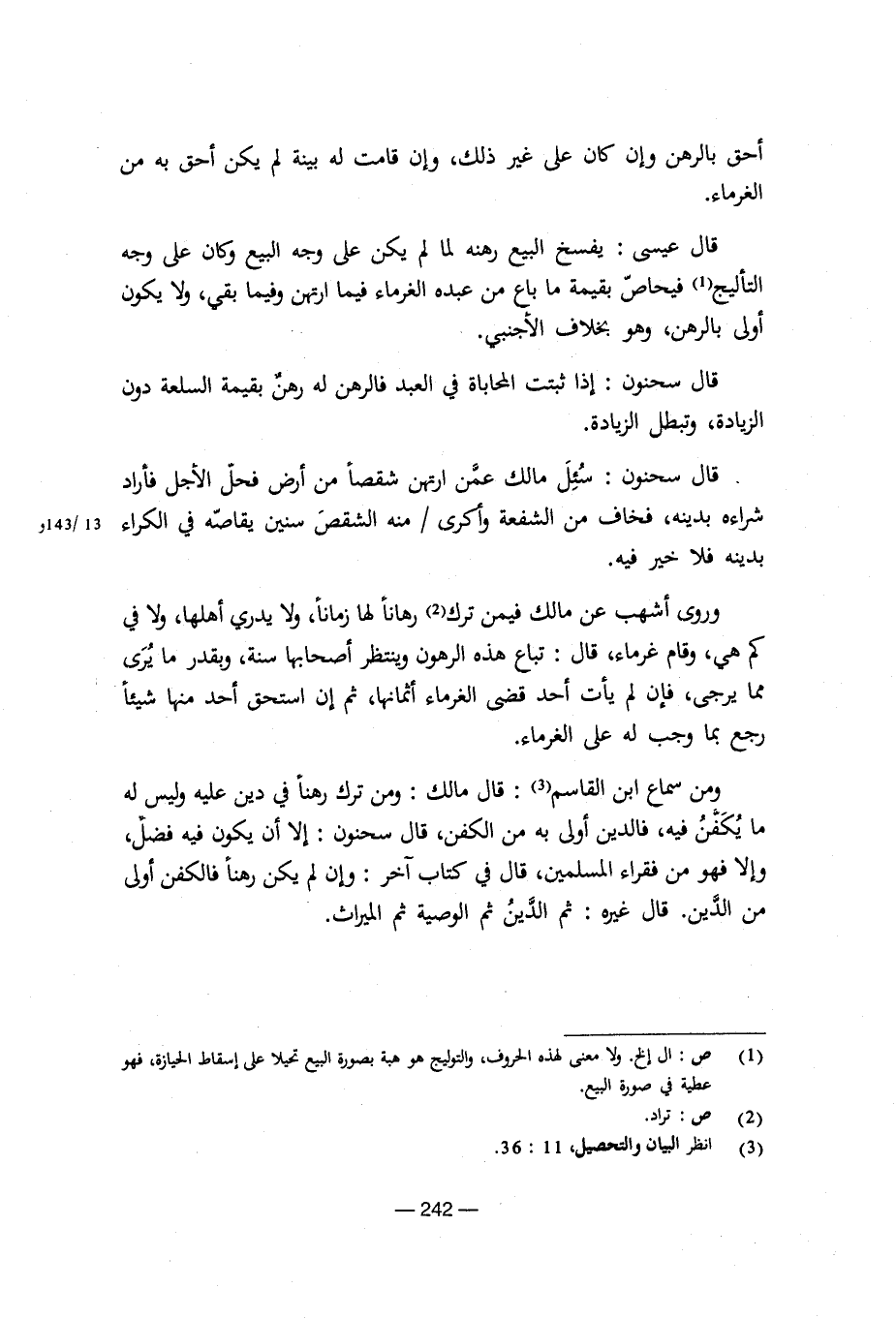 ومن سماع ابن القاسم: قال مالك: ومن ترك رهنا في دين عليه وليس له ما يكفن فيه، فالدين أولى به من الكفن، قال سحنون: إلا أن يكون فيه فضل، وإلا فهو من فقراء المسلمين، قال في كتاب آخر: وإن لم يكن رهنا فالكفن أولى من الدين. قال غيره: ثم الدين ثم الوصية ثم الميراث.