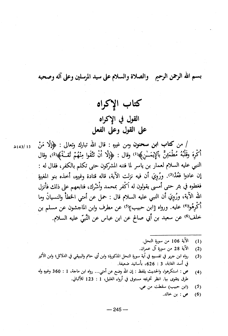 /من كتاب ابن سحنون ومن غيره: قال الله تبارك وتعالى: (إلا من أكره وقلبه مطمئن بالإيمان) وقال: (إلا أن تتقوا منهم تقه)، وقال النبي عليه السلام لعمار بن ياسر لما فتنه المشركون حتى تكلم بالكفر، فقال له: إن عادوا فعد. وروي أن فيه نزلت الآية، قاله قتادة وغيره، أخذه بنو المغيرة فغطوه في بئر حتى أمسى يقولون له أكفر بمحمد وأشرك، فتابعهم على ذلك فأنزل الله الآية، وروي أن النبي عليه السلام قال: حمل عن أمتي الخطأ والنسيان وما أكرهوا عليه. [ابن حبيب] عن مطرف وابن الماجشون عن مسلم بن خلف عن سعيد بن أبي صالح عن ابن عباس عن النبي عليه السلام.