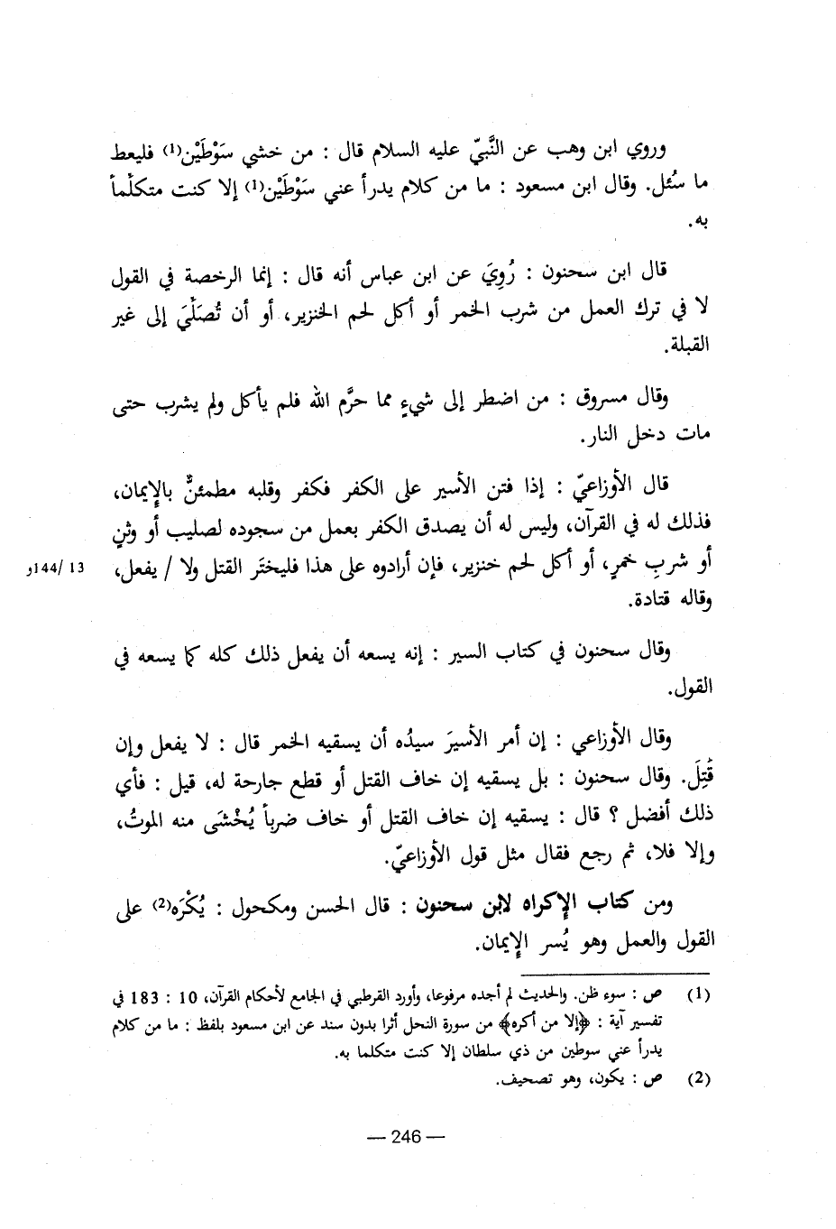 وروي ابن وهب عن النبي عليه السلام قال: من خشي سوطين فليعط ما سئل. وقال ابن مسعود: ما من كلام يدرا عني سوطين إلا كنت متكلما به.