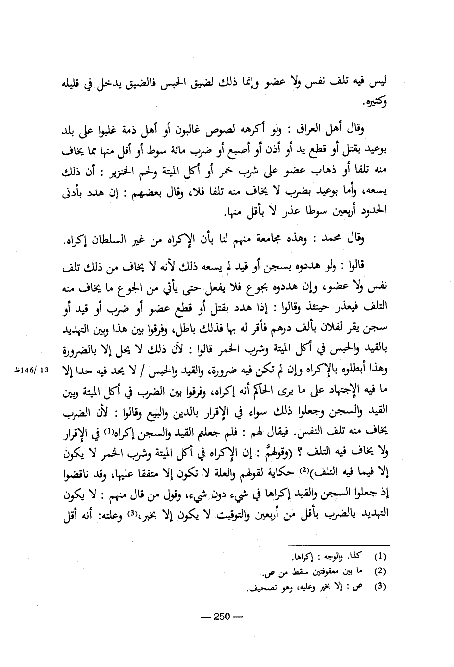 بالقيد والحبس في أكل الميتة وشرب الخمر قالوا: لأن ذلك لا يحل إلا بالضرورة وهذا أبطلوه بالإكراه وإن لم تكن فيه ضرورة، والقيد والحبس/لا يحد فيه حدا إلا ما فيه الإجتهاد على مايرد الحاكم أنه إكراه، وفرقوا بين الضرب في أكل الميتة وبين القيد والسجن وجعلوا ذلك سواء في الإقرار بالدين والبيع وقالوا: لأن الضرب يخاف منه تلف النفس. فيقال لهم: فلم جعلتم القيد والسجن إكراه في الإقرار ولا يخاف فيه التلف؟ (وقولهم: إن الإكراه في أكل الميتة وشرب الخمر لا يكون إلا فيما فيه التلف) حكاية لقولهم والعلة لا تكون إلا متفقا عليها، وقد ناقضوا إذ جعلوا السجن والقيد إكراها في شيء، وقول من قال منهم: لا يكون التهديد بالضرب بأقل من أربعين والتوقيت لا يكون إلا بخبر وعلته: أنه أقل