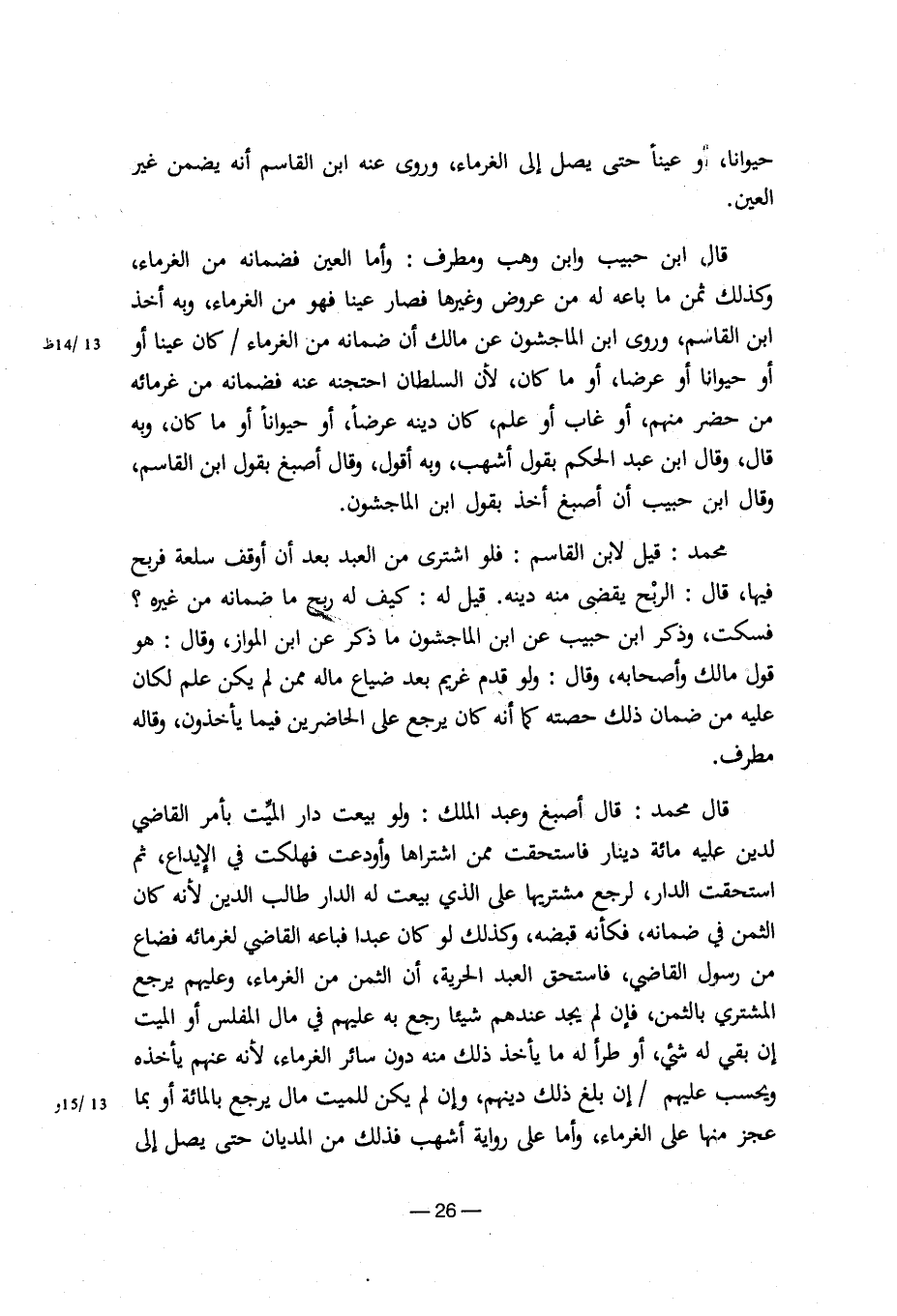 قال أبن حبيب وابن وهب ومطرف: وأما العين فضمانه من الغرماء، وكذلك ثمن ما باعه له من عروض وغيرها فصار عينا فهو من الغرماء، وبه أخذ ابن القاسم، وروى ابن الماجشون عن مالك أن ضمانه من الغرماء/كان عينا أو أو حيوانا أو عرضا، أو ما كان، لأن السلطان احتجنه عنه فضمانه من غرمائه من حضر منهم، أو غاب أو علم، كان دينه عرضا، أو حيوانا أو ما كان، وله قال: وقال ابن عبد الحكم بقول أشهب، وبه أقول، وقال أصبغ بقول ابن القاسم، وقال ابن حبيب أن أصبغ أخذ بقول ابن الماجشون.