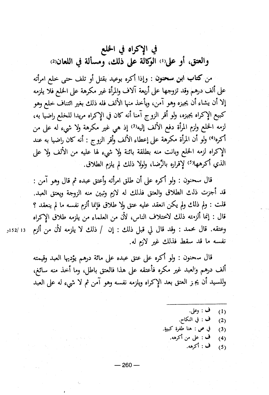 قلت: ولم ألزمنه ذلك لاختلاف الناس، لأن من العلماء من يلزمه طلاق الإكراه وعتقه. قال محمد: وقد قال لي قبل ذلك: إن/ذلك لا يلزمه لأن من ألزم نفسه ما قد سقط فذلك غير لازم له.