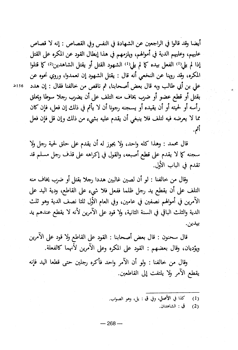 أيضًا وقد قالوا في الراجعين عن الشهادة في النفس وفي القصاص: إنه لا قصاص عليهم، وعليهم الدية في أموالهم، ويلزمهم في هذا إبطال القود عن المكره على القتل إذا لم يلي الفعل بيده كما لم يلي الشهود القتل أو يقتل الشاهدين كما قتلوا المكره، وقد روينا عن النخعي أنه قال: يقتل الشهود إن تعمدوا، وروي نحوه عن علي بن أبي طالب وبه قال بعض أصحابنا، ثم ناقص من خالفنا فقال: إن هدد بقتل أو قطع عضو أو ضرب يخاف منه التلف على أن يضرب رجلا سوطا ويحلق رأسه أو لحيته أو أن يقيده أو يسجنه رجونا أن لا يأثم في ذلك إن فعل، فإن كان مما لا يعرضه فيه لتلف فلا ينبغي أن يقدم عليه بشيء من ذلك وإن قل فإن فعل أثم.