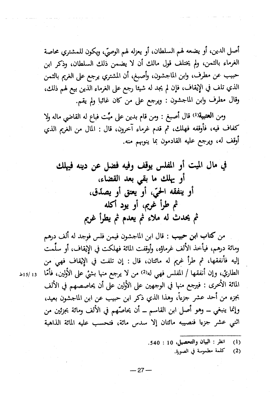 في مال الميت أو المفلس يوقف وفيه فضل عن دينه فيهلك أو يهلك ما بقي بعد القضاء ثم طرأ الحي، أو يعتق أو يصدق، ثم طرأ غريم، أو يود أكله ثم يحدث له ملاء ثم يعدم ثم يطرأ غريم
