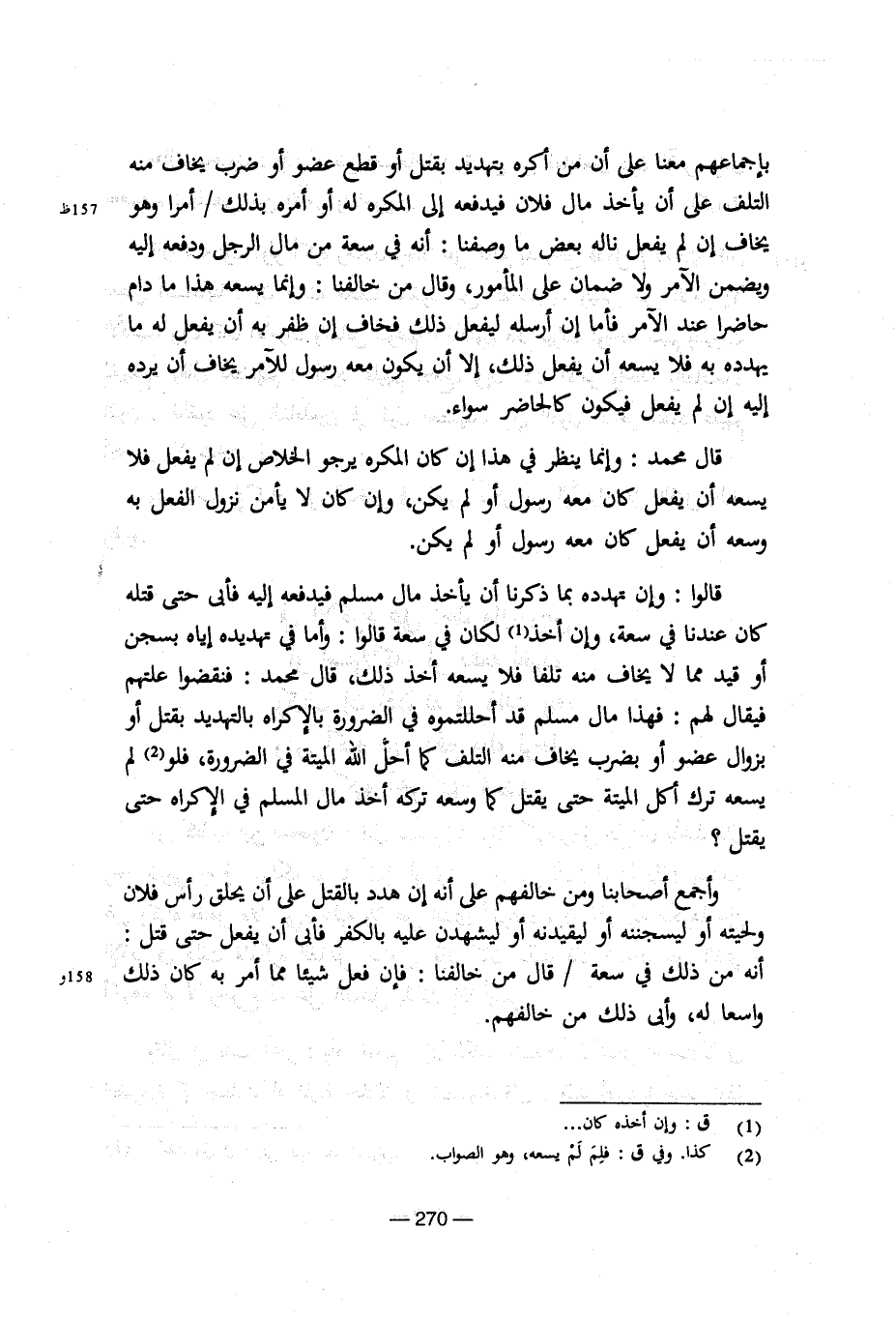 قالوا: وإن تهدده بما ذكرنا أن يأخذ مال مسلم فيدفعه إليه فأبى حتى قتله كان عندنا في سعة، وإن أخذ لكان في سعة قالوا: وأما في تهديده إياه بسجن أو قيد مما لا يخاف منه تلفا فلا يسعه أخذ ذلك، قال محمد: فنقضوا علتهم فيقال لهم: فهذا مال مسلم قد أحللتموه في الضرورة بالإكراه بالتهديد بقتل أو بزوال عضو أو بضرب يخاف منه التلف كما أحل الله الميتة في الضرورة فلو لم يسعه ترك أكل الميتة حتى يقتل كما وسعه تركه أخذ مال السلم في الإكراه حتى يقتل؟