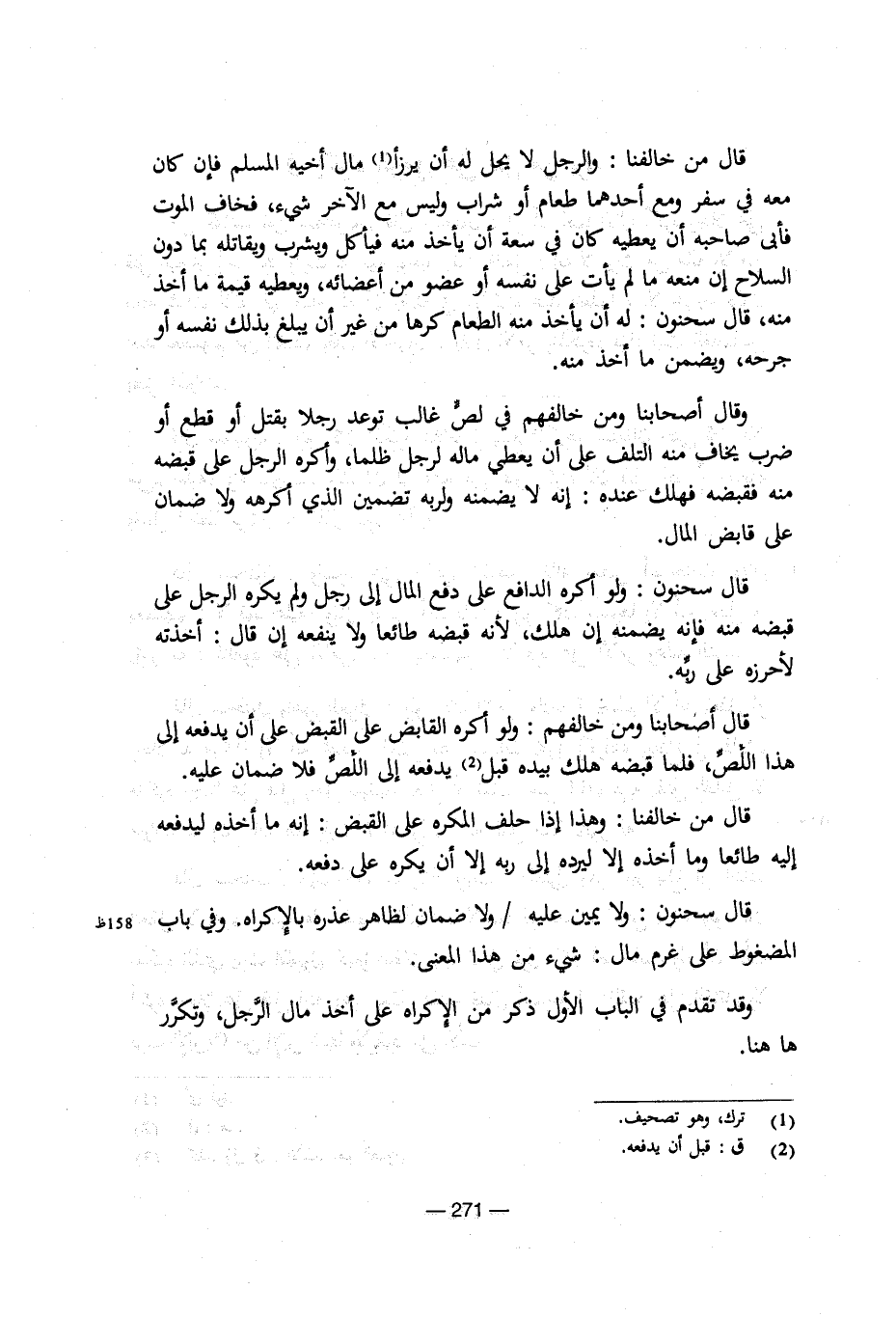 قال من خالفنا: والرجل لا يحل له أن يرزا مال أخيه المسلم فإن كان معه في سفر ومع أحدهما طعام أو شراب وليس مع الأخر شيء، فخاف الموت فأبى صاحبه أن يعطيه كان في سعة أن يأخذ منه فيأكل ويشرب ويقاتله بما دون السلاح إن منعه ما لم يأت على نفسه أو عضو من أعضائه، ويعطيه قيمة ما أخذ منه، قال سحنون: له أن يأخذ منه الطعام كرها من غير أن يبلغ بذلك نفسه أو جرحه، ويضمن ما أخذ منه.