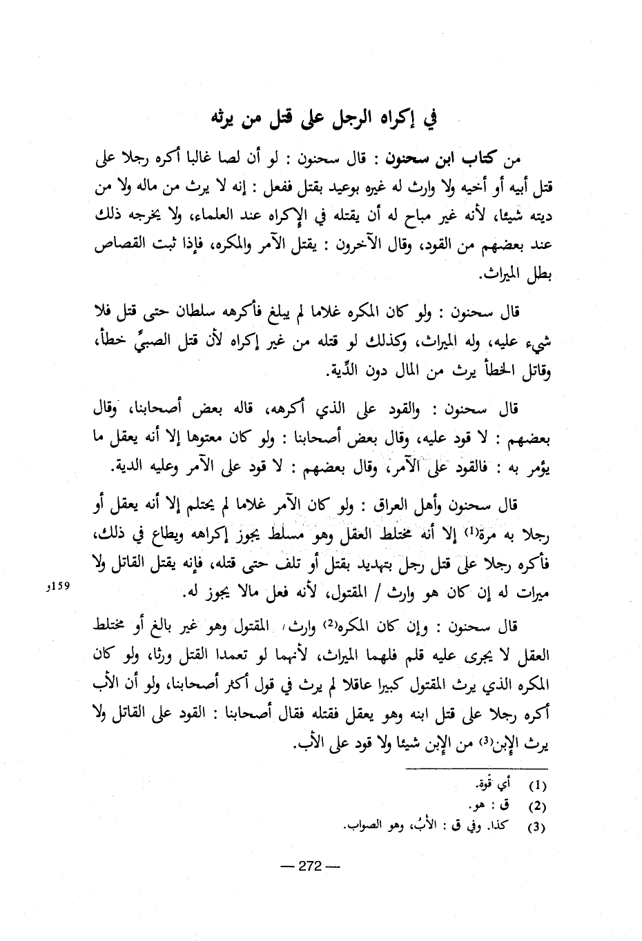 من كتاب ابن سحنون: قال سحنون: لو أن لصا غالبا أكره رجلا على قتل أبيه أو أخيه ولا وارث له غيره بوعيد بقتل ففعل: إنه لا يرث من مله ولا من دينه شيئا، لأنه غير مباح له أن يقتله في الإكراه عند المعلماء، ولا يخرجه ذلك عند بعضهم من القود، وقال الآخرون: يقتل الآمر والمكره، فإذا ثبت القصاص بطل الميراث.