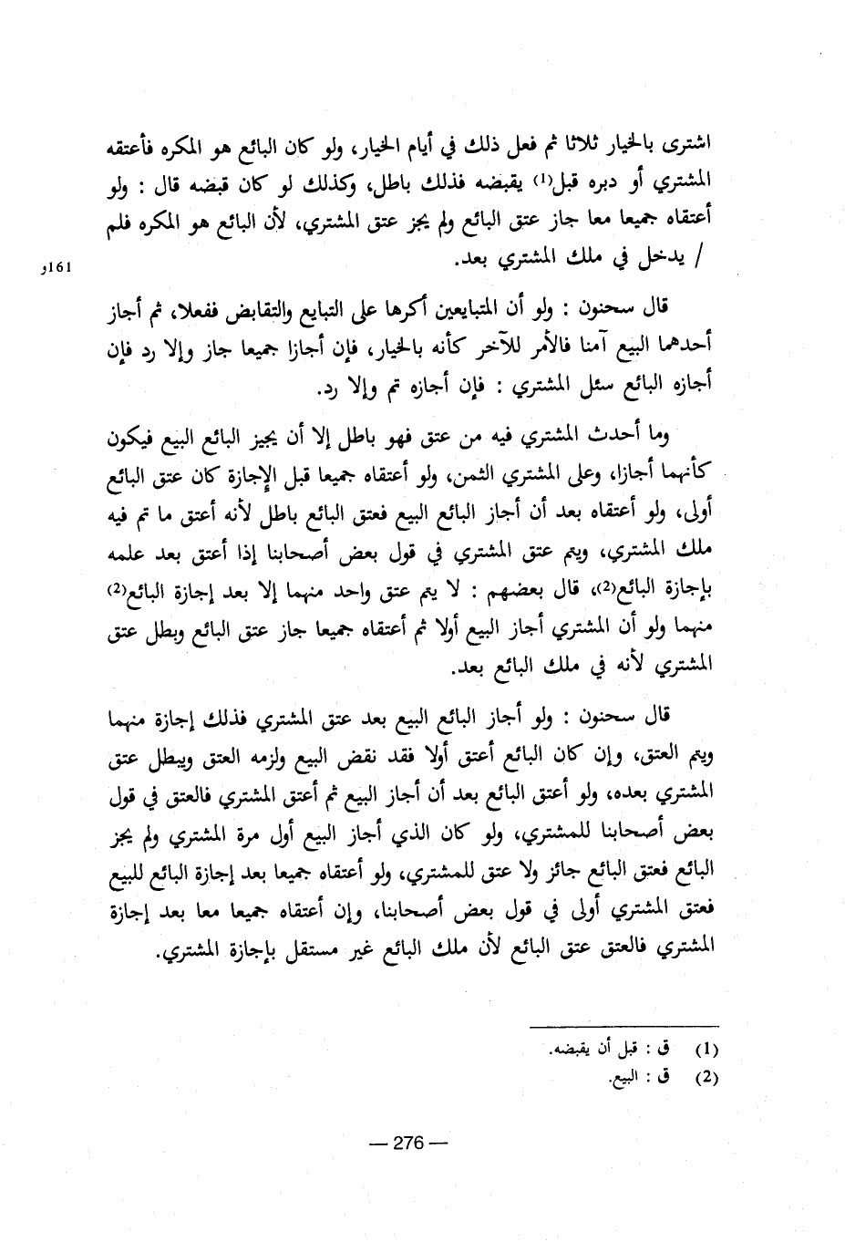 قال سحنون: ولو أجاز البائع البيع بعد عتق المشتري فذلك إجازة منهما ويتم العتق، وإن كان البائع أعتق أولا فقد نقض البيع ولزمه العتق ويبطل عتق المشتري بعده، ولو أعتق البائع بعد أن أجاز البيع ثم أعتق المشتري فالعتق في قول بعض أصحابنا للمشتري، ولو كان الذي أجاز البيع أول مرة المشتري ولم يجز البائع فعتق البائع جائز ولا عتق للمشتري، ولو أعتقاه جميعا بعد إجازة البائع للبيع فعتق المشتري أولى في قول بعض أصحابنا، وإن أعتقاد جميعا معا بعد إجازة المشتري فالعتق عتق البائع لأن ملك البائع غير مستقل بإجازة المشتري.
