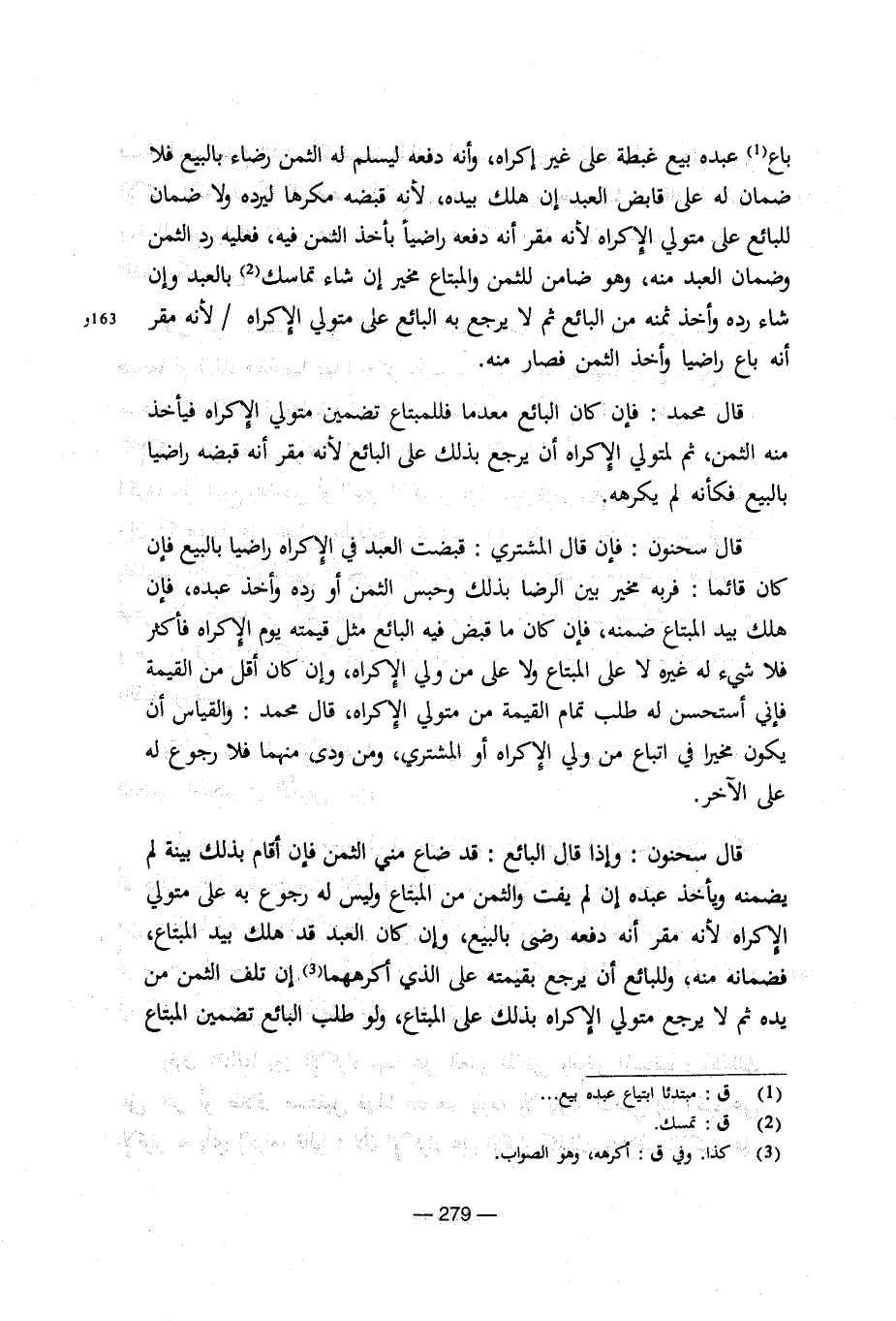 قال سحنون: فإن قال المشتري: قبضت العبد في الإكراه راضيا بالبيع فإن كان قائما: فربه مخير بين الرضا بذلك وحبس الثمن أو رده وأخذ عبده، فإن هلك بيد المبتاع ضمنه، فإن كان ما قبض فيه البائع مثل قيمته يوم الإكراه فأكثر فلا شيء له غيره لا على المبتاع ولا على من ولي الإكراه، وإن كان أقل من القيمة فإني أستحسن له طلب تمام القيمة من متولي الإكراه، قال محمد: والقياس أن يكون مخيرا في إتباع من ولي الإكراه أو المشتري، ومن ودي منهما فلا رجوع له على الآخر.