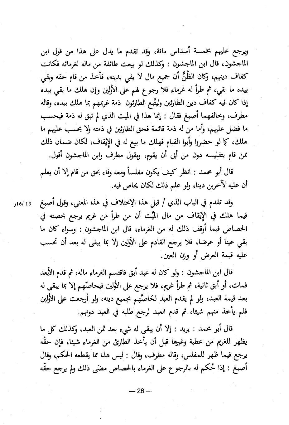 وقد تقدم في الباب الذي/قبل هذا الاختلاف في هذا المعنى، وقول أصبغ فيما هلك في الإيقاف من مال الميت أن من طرأ من غريم يرجع بحصته في الحصاص فيما أوقف ذلك له من الغرماء، قال ابن الماجشون: وسواء كان ما بقي عينا أو عرضا، فلا يرجع القادم على الأولين إلا بما يبقى له بعد أن تحسب عليه قيمة العرض أو وزن العين.