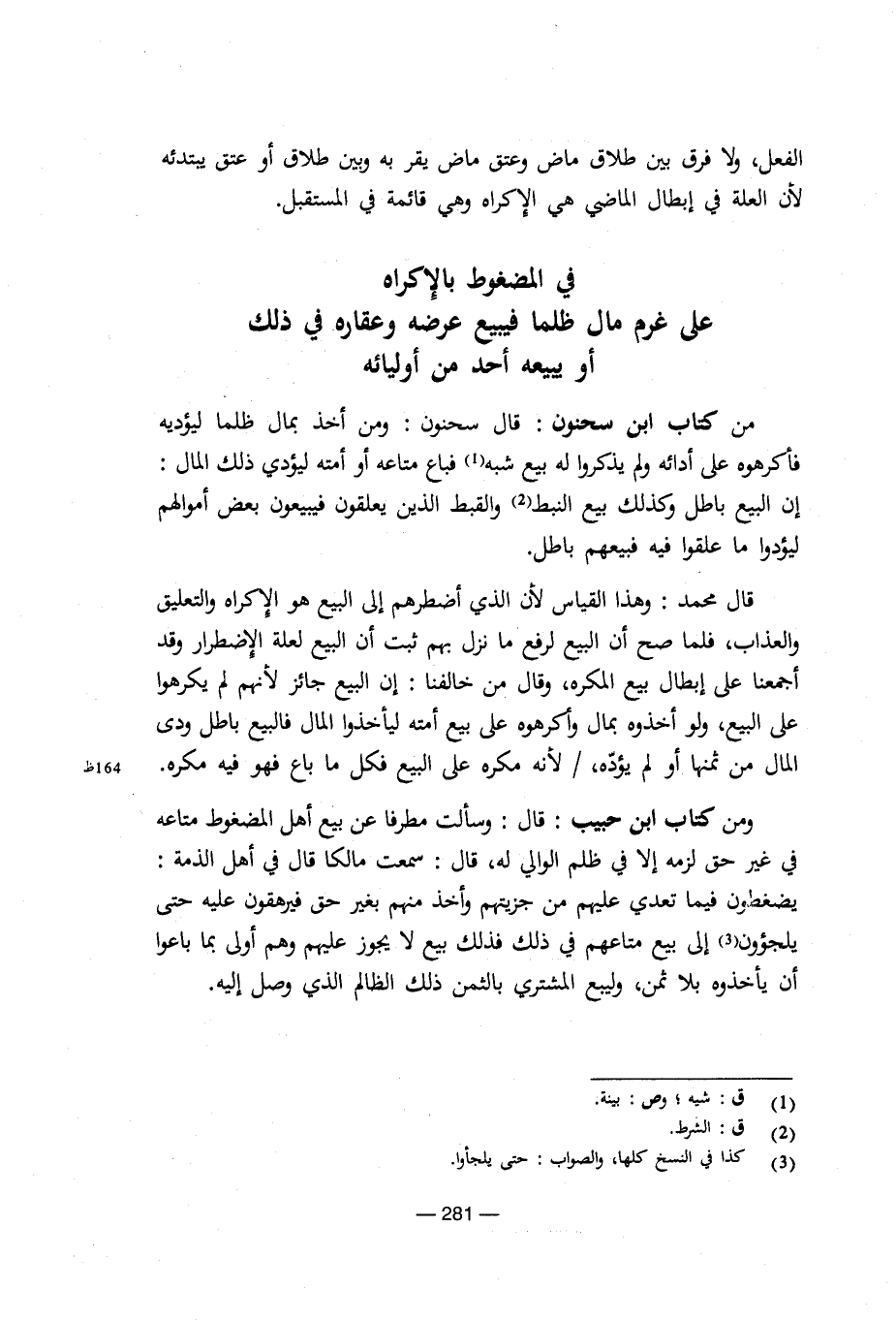 من كتاب ابن سحنون: قال سحنون: ومن أخذ بمال ظلما ليؤديه فأكرهوه على أدائه ولم يذكروا له بيع شبه فباع متاعه أو أمته ليؤدي ذلك المال: إن البيع باطل وكذلك بيع النبط والقبط الذين يعلقون فيبيعون بعض أموالهم ليؤدوا ما علقوا فيه فبيعهم باطل.
