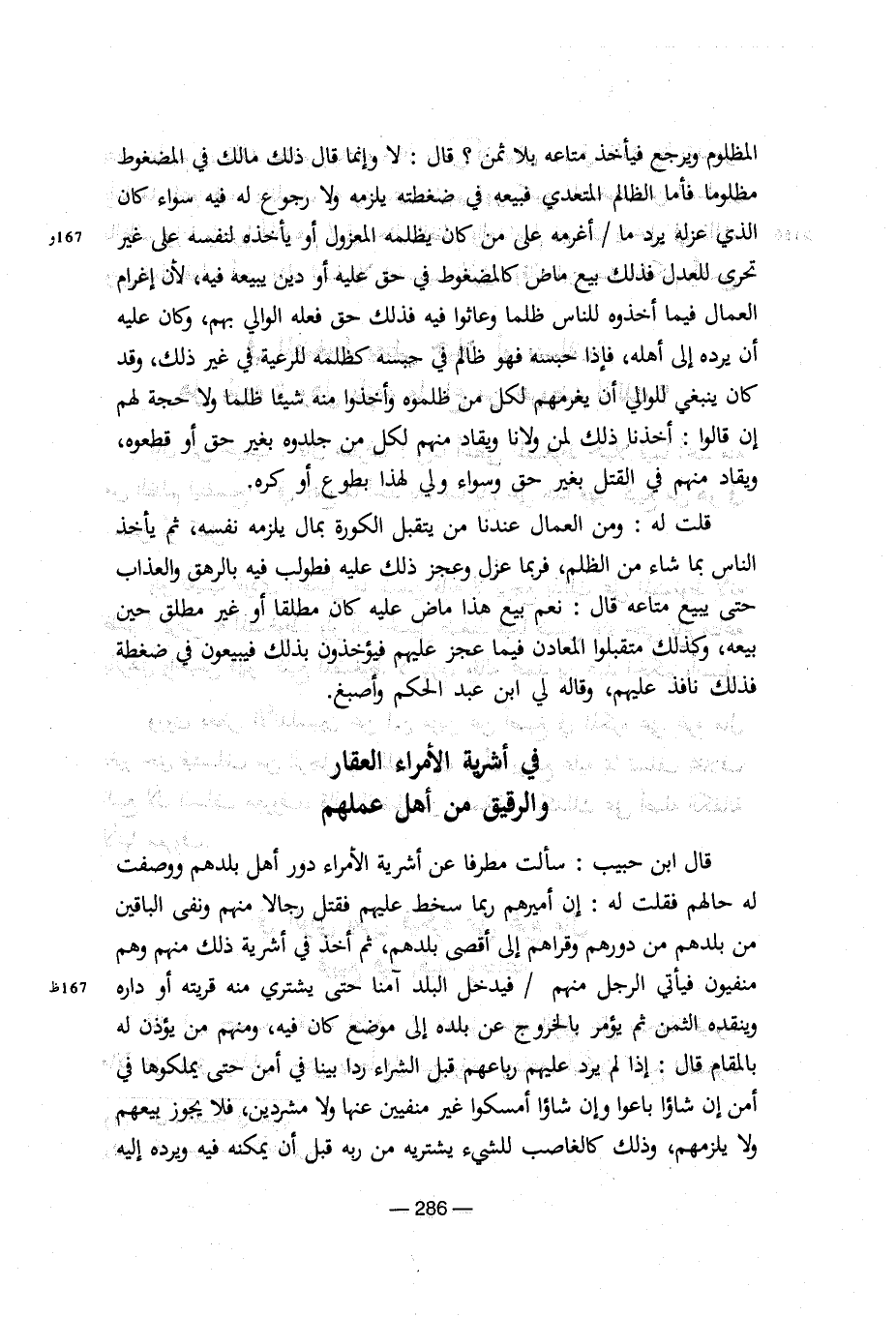 قال ابن حبيب: سألت مطرفا عن أشريه الأمراء دور أهل بلدهم ووصفت له حالهم فقلت له: إن أميرهم ربما سخط عليهم فقتل رجالا منهم ونفى الباقين من بلدهم من دورهم وقراهم إلى أقصى بلدهم، ثم أخذ في أشريه ذلك منهم وهم منفيون فيأتي الرجل منهم/فيدخل البلد آمنا حتى يشتري منه قريته أو داره وينقده الثمن ثم يؤمر بالخروج عن بلده إلى موضع كان فيه، ومنهم من يؤذن له بالمقام قال: إذا لم يرد عليهم رباعهم قبل الشراء ردا بينا في أمن حتى يملكوها في أمن إن شاؤا باعوا وإن شاؤا أمسكوا غير منفيين عنها ولا مشردين، فلا يجوز بيعهم ولا يلزمهم، وذلك كالغاصب للشيء يشتريه من ربه قبل أن يمكنه فيه ويرده إليه