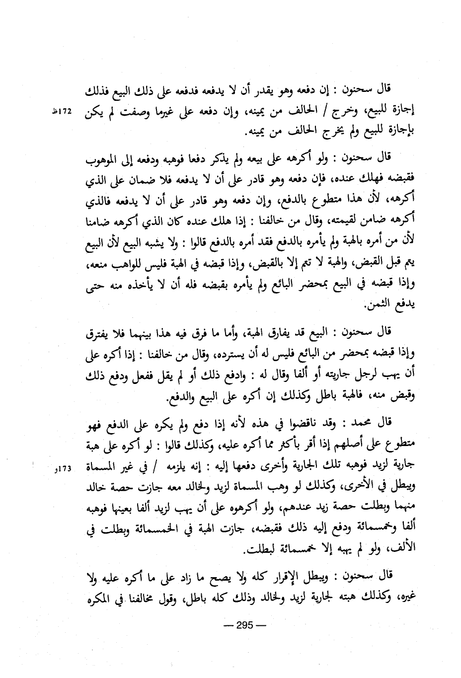قال سحنون: البيع قد يفارق الهبة، وأما ما فوق فيه هذا بينهما فلا يفترق وإذا قبضه بمحضر من البائع فليس له أن يسترده وقال من خالفنا: وإذا اكره على أن يهب لرجل جاريته أو ألفا وقال له: وادفع ذلك أو لم يقل ففعل ودفع ذلك وقبض منه، فالهبة باطل وكذلك إن أكره على البيع والدفع.