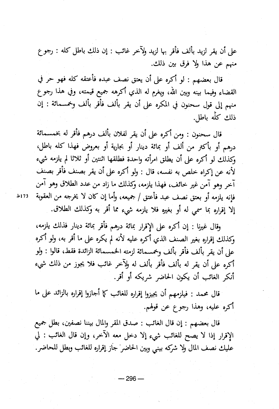 قال سحنون: ومن أكره على أن يقر لفلان بألف درهم فأقر له بخمسمائة درهم أو بأكثر من ألف أو بمائة دينار أو بجارية أو بعروض فهذا كله باطل، وكذلك لو أكره على أن يطلق امرأته واحدة فطلقها اثنتين أو ثلاثا لم يلزمه شيء لأنه عن إكراه خلص به نفسه، قال: ولو أكره على أن يقر بصنف فأقر بصنف آخر وهو آمن غير خائف، فهذا يلزمه، وكذلك ما زاد من عدد الطلاق وهو آمن فإنه يلزمه أو بعتق نصف عبد فأعتق/جميعه، وأما إن كان لا يخرجه من العقوبة إلا إقراره بما سمي له أو بغيره فلا يلزمه شيء مما أقر به وكذلك الطلاق.