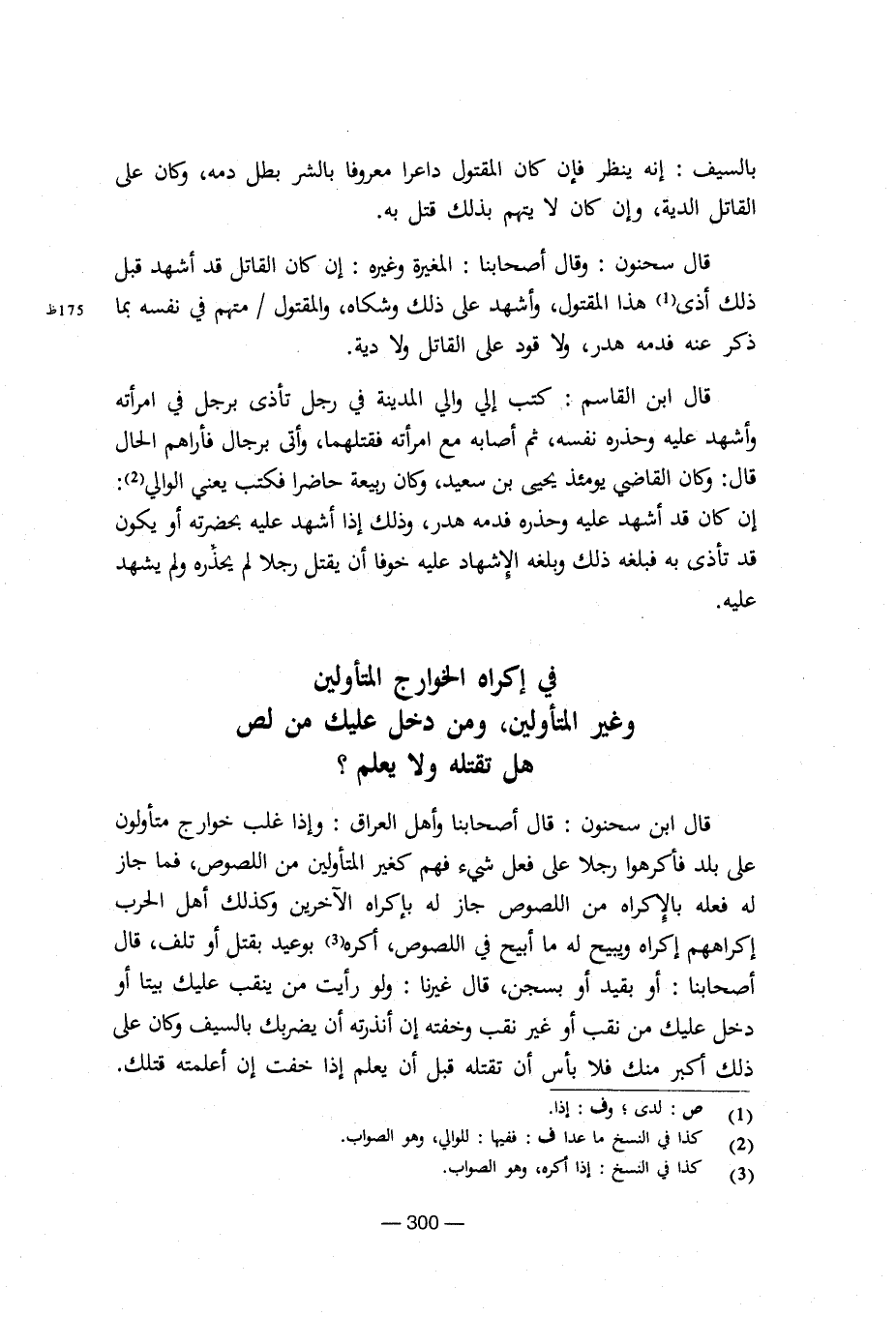 قال ابن سحنون: قال أصحابنا وأهل العراق: وإذا غلب خوارج متأولين على بلد فأكرهوا رجلا على فعل شيء كغير المتأولين من اللصوص، فما جاز له فعله بالإكراه من اللصوص جاز له بإكراه الآخرين وكذلك أهل الحرب إكراههم إكراه ويبيح له ما أبيه في اللصوص، أكره بوعيد بقتل أو تلف، قال أصحابنا: أو بقيد أو بسجن، قال غيرنا: ولو رأيت من ينقب عليك بيتا أو دخل عليك من نقب أو غير نقب وخفته إن أنذرته أن يضربك بالسيف وكان على ذلك أكبر منك فلا بأس أن تقتله قبل أن يعلم إذا خفت إن أعلمته قتلك.
