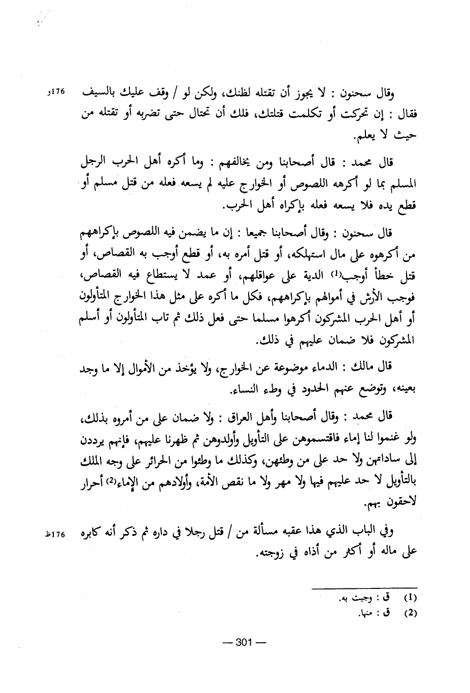 قال سحنون: وقال أصحابنا جميعا: إن ما يضمن فيه اللصوص بإكراههم من أكرهوه على مال استهلكه، أو قتل أمره به، أو قطع أوجب به القصاص، أو قتل خطأ أوجب الدية على عواقلهم، أو عمد لا يستطاع فيه القصاص، فوجب الأرش في أموالهم بإكراههم، فكل ما أكره على مثل هذا الخوارج المتأولون أو أهل الحرب المشركون أكرهوا مسلما حتى فعل ذلك ثم تاب المتأولون أو أسلم المشركون فلا ضمان عليهم في ذلك.