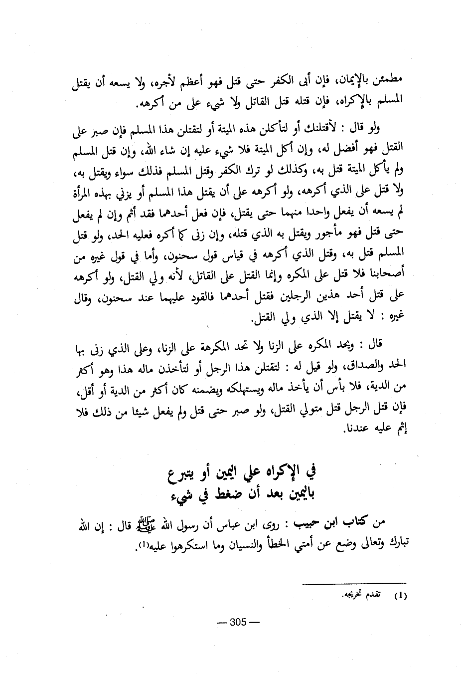 من كتاب ابن حبيب: روى ابن عباس أن رسول الله صلى الله عليه وسلم قال: إن الله تبارك وتعالى وضع عن أمتي الخطأ والنسيان وما استكرهوا عليه.