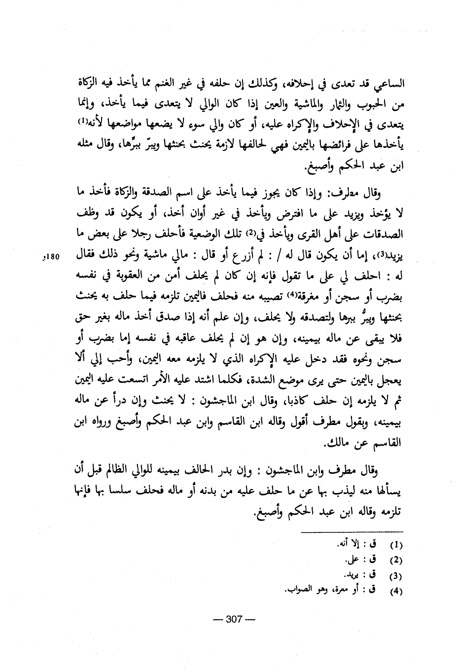وقال مطرف: وإذا كان يجوز فيما يأخذ على اسم الصدقة والزكاة فأخذ ما لا يؤخذ ويزيد على ما افترض ويأخذ في غير أوان أخذ، أو يكون قط وظف الصدقات على أهل القرى ويأخذ في تلك الوضعية فأحلف رجلا على بعض ما يزيد، إما أن يكون قال له/: لم أزرع أو قال: مالي ماشية ونحو ذلك فقال له: احلف لي على ما تقول فإنه إن كن لم يحلف أمن من العقوبة في نفسه بضرب أو سجن أو مغرقة تصيبه منه فحلف فاليمين تلزمه فيما حلف به يحنث بحنثها ويبر ببرها ولتصدقه ولا يحلف، وإن علم أنه إذا صدق أخذ ماله بغير حق فلا يبقى عن ماله بيمينه، وإن هو إن لم يحلف عاقبه في نفسه إما بضرب أو سجن ونحوه فقد دخل عليه الإكراه الذي لا يلزمه معه اليمين، وأحب غلي ألا يعجل باليمين حتى يرى موضع الشدة، فكلما اشتد عليه الأمر اتسعت عليه اليمين ثم لا يلزمه إن حلف كاذبا، وقال ابن الماجشون: لا يحنث وإن درأ عن ماله بيمينه، وبقول مطرف أقول وقاله ابن القاسم وابن عبد الحكم وأصبغ ورواه ابن القاسم عن مالك.
