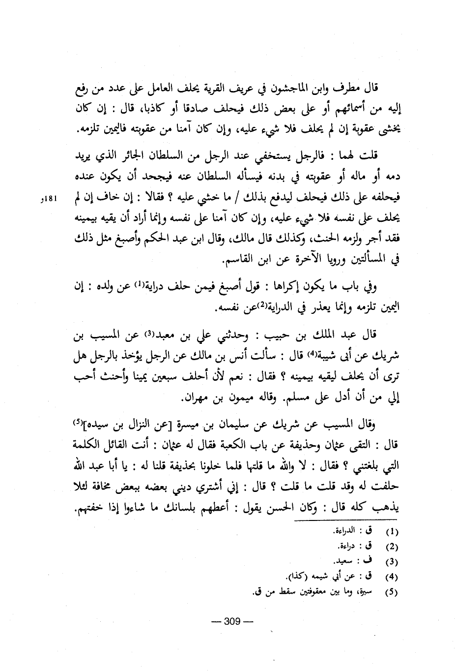 وقال المسيب عن شريك عن سليمان بن ميسرة [عن النزال بن سيده] قال: التقى عثمان وحذيفة عن باب الكعبة فقال له عثمان: أنت القائل الكلمة التي بلغتني؟ فقال: لا والله ما قلتها فلما خلونا بحذيفة فلنا له: يا أبا عبد الله حلفت له وقد قلت ما قلت؟ قال إني أشتري ديني بعضه ببعض مخافة لئلا يذهب كله قال: وكان الحسن يقول: أعطهم بلسانك ما شاءوا إذا خفتهم.