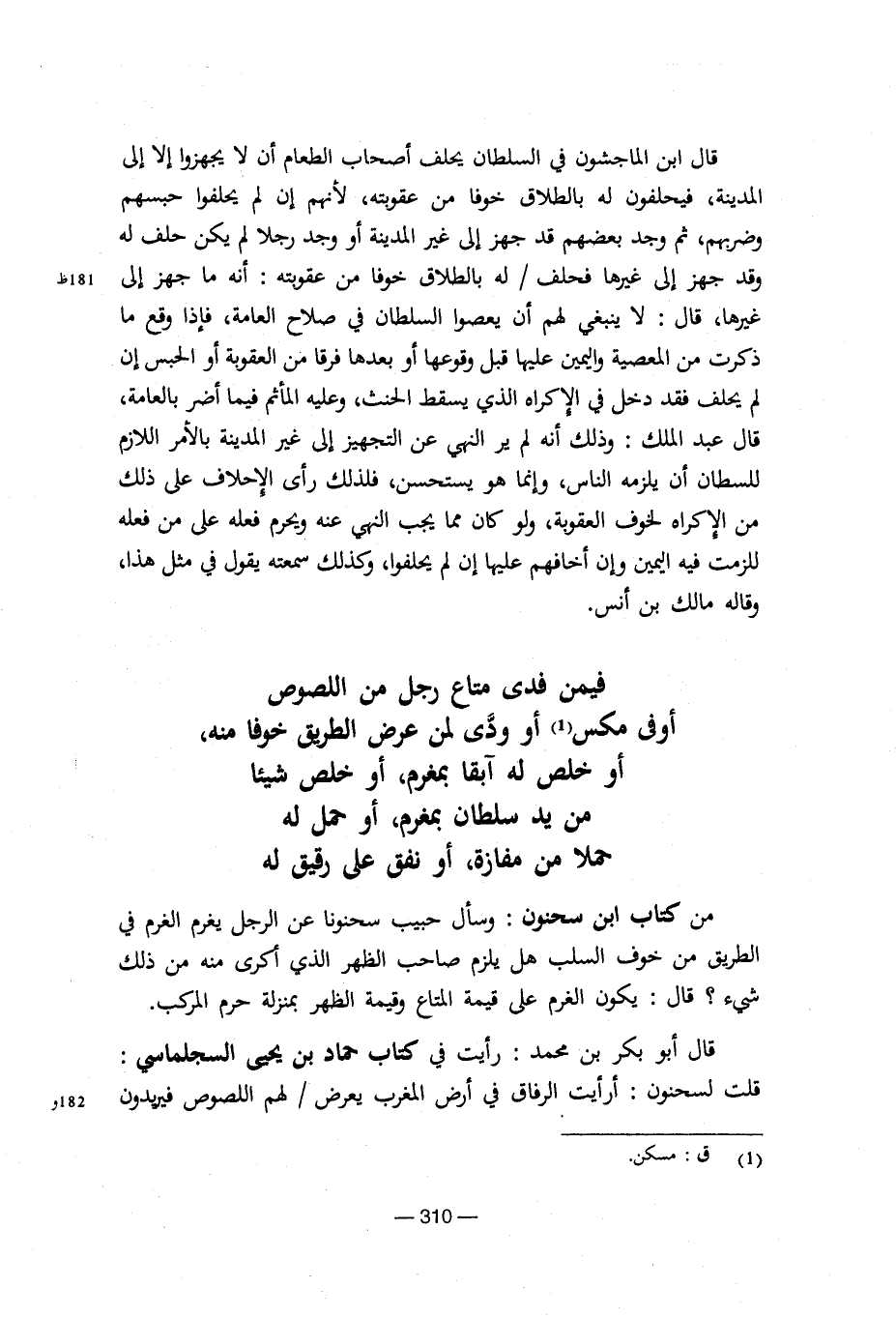 قال أبو بكر بن محمد: رأيت في كتاب حماد بن يحيى السجلماسي: قلت لسحنون: أرأيت الرفاق في أرض المغرب يعرض/لهم اللصوص فيريدون