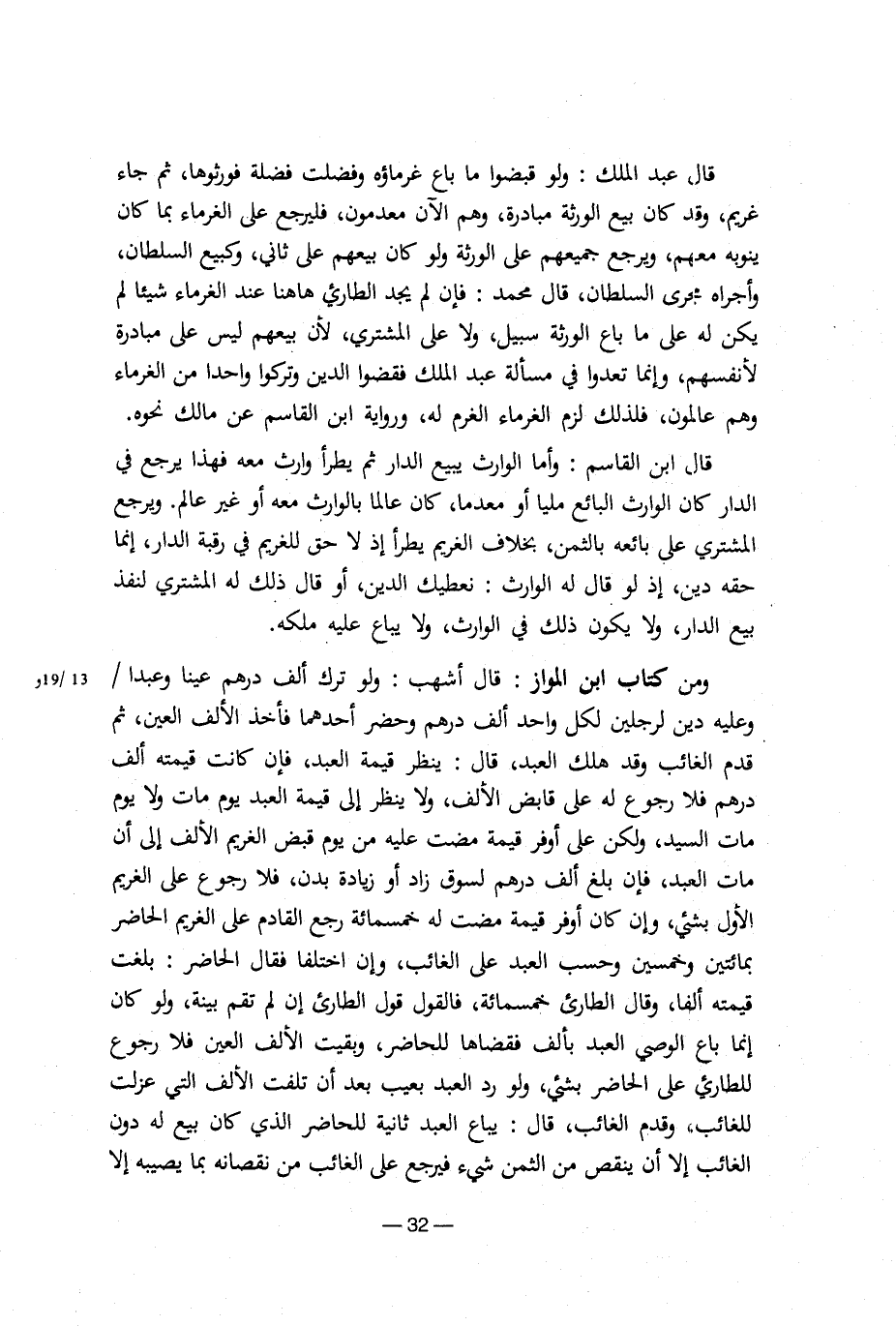 قال ابن القاسم: وأما الوارث يبيع الدار ثم يطرأ وارث معه فهذا يرجع في الدار كان الوارث البائع مليا أو معدما، كان عالما بالوارث معه أو غير عالم، ويرجع المشتري على بائعه بالثمن، بخلاف الغريم يطرأ إذ لا حق للغريم في رقبة الدار، إنما حقه دين، إذ لو قال له الوارث: نعطيك الدين، أو قال ذلك له المشتري لنفذ بيع الدار، ولا يكون ذلك في الوارث، ولا يباع عليه ملكه.