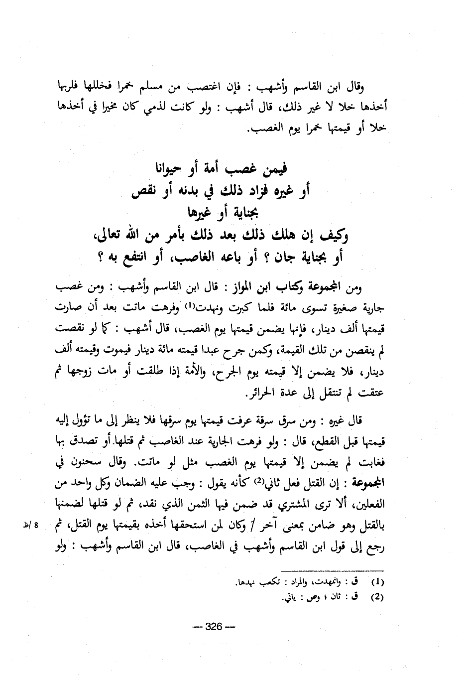 ومن المجموعة وكتاب ابن المواز: قال ابن القاسم وأشهب: ومن غصب جارية صغيرة تسوى مائة فلما كبرت ونهدت وفرهت ماتت بعد أن صارت قيمتها ألف دينار، فإنها يضمن قيمتها يوم الغصب، قال أشهب: كما لو نقصت لم ينقصن من تلك القيمة، وكمن جرح عبدا قيمته مائة دينار فيموت وقيمته ألف دينار، فلا يضمن إلا قيمته يوم الجرح، والأمة إذا طلقت أو مات زوجها ثم عتقت لم تنتقل إلى عدة الحرائر.