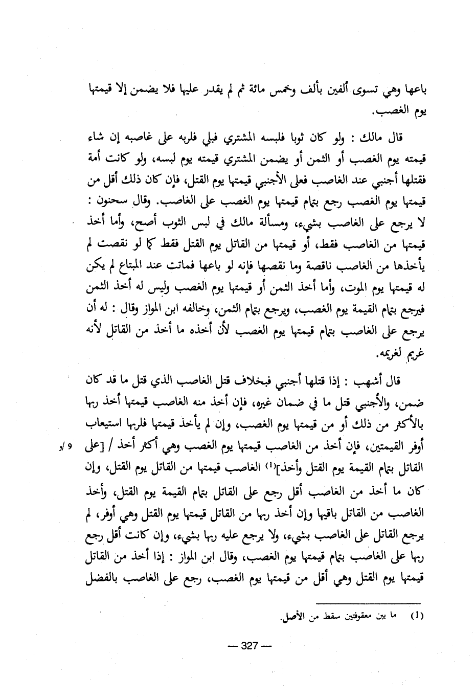 قال مالك: ولو كان ثوبا فلبسه المشتري فبلي فلربه على غاصبه إن شاء قيمته يوم الغصب أو الثمن أو يضمن المشتري قيمته يوم لبسه، ولو كانت أمة فقتلها أجنبي عند الغاصب فعلى الأجنبي قيمتها يوم القتل، فإن كان ذلك أقل من قيمتها يوم الغصب رجع بتمام قيمتها يوم الغصب على الغاصب. وقال سحنون: لا يرجع على الغاصب بشيء، ومسألة مالك في لبس الثوب أصح، وأما أخذ قيمتها من الغاصب فقط، أو قيمتها من القاتل يوم القتل فقط كما لو نقصت لم يأخذها من الغاصب ناقصة وما نقصها فإنه لو باعها فماتت عند المبتاع لم يكن له قيمتها يوم الموت، وأما أخذ الثمن أو قيمتها يوم الغصب وليس له أخذ الثمن فيرجع بتمام القيمة يوم الغصب، ويرجع بتمام الثمن، وخالفه ابن المواز وقال: له أن يرجع على الغاصب بتمام قيمتها يوم الغصب لأن أخذه ما أخذ من القاتل لأنه غريم لغريمه.