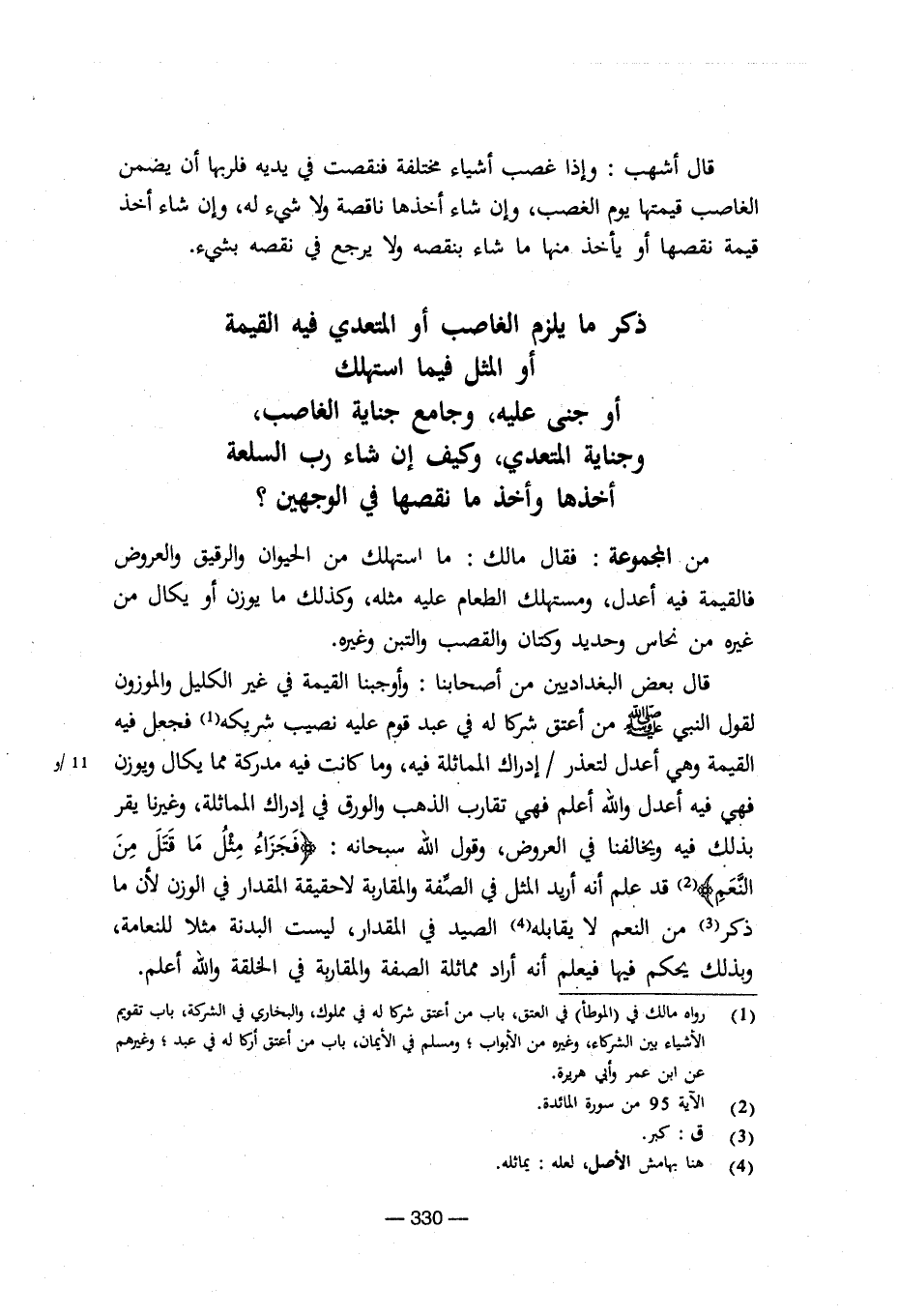 من المجموعة: فقال مالك: ما استهلك من الحيوان والرقيق والعروض فالقيمة فيه أعدل، ومستهلك الطعام عليه مثله، وكذلك ما يوزن أو يكال من غيره من نحاس وحديد وكتان والقصب والتبن وغيره.