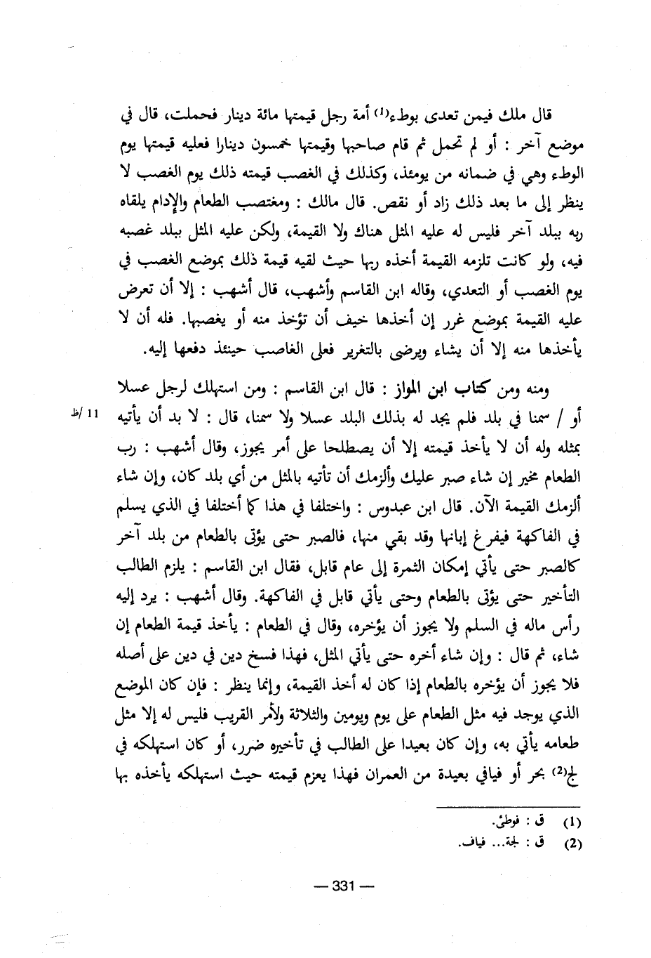 ومنه ومن كتاب ابن المواز: قال ابن القاسم: ومن استهلك لرجل عسلا أو/سمنا في بلد فلم يجد له بذلك البلد عسل ولا سمنا، قال: لا بد أن يأتيه بمثله وله أن لا يأخذ قيمته إلا أن يصطلحا على أمر يجوز، وقال أشهب: رب الطعام مخير إن شاء صبر عليك وألزمك أن تأتيه بالمثل من أي بلد كان، وإن شاء ألزمك القيمة الآن. قال ابن عبدوس: واختلفا في هذا كما اختلفا في الذي يسلم في الفاكهة فيفرغ إبانها وقد بقي منها، فالصبر حتى يؤتى بالطعام من بلد آخر كالصبر حتى يأتي إمكان الثمرة إلى عام قبل، فقال ابن القاسم: يلزم الطالب التأخير حتى يؤتى بالطعام وحتى يأتي قابل في الفاكهة. وقال أشهب: يرد إليه رأس ماله في السلم ولا يجوز أن يؤخره، وقال في الطعام: يأخذ قيمة الطعام إن شاء، ثم قال: وإن شاء أخره حتى يأتي المثل، فهذا فسخ دين في دين على أصله فلا يجوز أن يؤخره بالطعام إذا كان له أخذ القيمة، وإنما ينظر: فإن كان الموضع الذي يوجد فيه مثل الطعام على يوم ويومين والثلاثة ولأمر القريب فليس له إلا مثل طعامه يأتي به، وإن كان بعيدا على الطالب في تأخيره ضرر، أو كان استهلكه في لج بحر أو فيافي بعيدة من العمران فهذا يعزم قيمته حيث استهلكه يأخذه بها