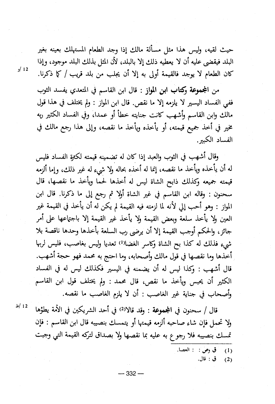 وقال أشهب في الثوب والعبد إذا كان له تضمينه قيمته لكثرة الفساد فليس له أن يأخذه ويأخذ ما نقصه، إنما له أخذه بحاله ولا شيء له غير ذلك، وإما ألزمه قيمته جميعه وكذلك ذابح الشاة ليس له أخذها لحما ويأخذ ما نقصها، قال سحنون: وقاله ابن القاسم في غير الشاة أولا ثم رجع إلى ما ذكرنا. قال ابن المواز: وهو أحب إلي لأنه لما لزمته فيه القيمة لم يكن له أن يأخذ في القيمة غير العين ولا يأخذ سلعة وبعض القيمة ولا يأخذ غير القيمة إلا باجتماعها على أمر جائز، والحكم أوجب القيمة إلا أن يرضى رب السلعة بأخذها وحدها ناقصة بلا شيء فذلك له كذا بح الشاة وكاسر الغضا تعديا وليس بغاصب، فليس لربها أخذها وما نقصها في قول مالك وأصحابه، وما احتج به محمد فهو حجة أشهب، قال أشهب: وكذا ليس له أن يضمنه في اليسير فكذلك ليس له الفساد الكثير أن يحبس ويأخذ ما نقص، قال محمد: ولم يختلف قول ابن القاسم وأصحاب في جناية غير الغاصب: أن لا يلزم الغاصب ما نقصه.