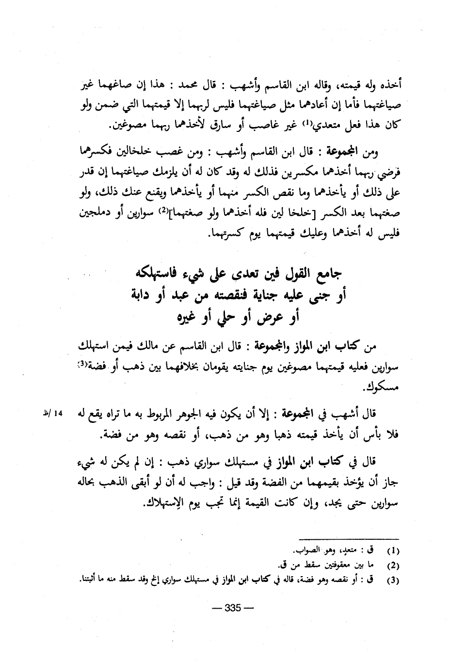 من كتاب ابن المواز والمجموعة: قال ابن القاسم عن مالك فيمن استهلك سوارين فعليه قيمتهما مصوغين يوم جنايته يقومان بخلافهما بين ذهب أو فضة مسكوك.