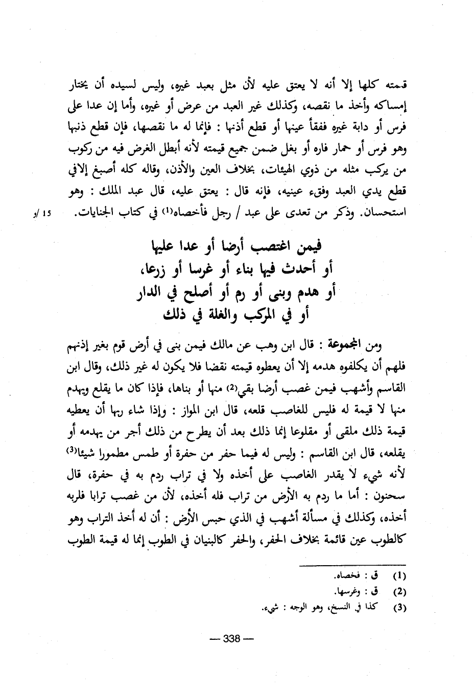 ومن المجموعة: قال ابن وهب عن مالك فيمن بنى في أرض قوم بغير إذنهم فلهم أن يكفوه هدمه إلا أن يعطوه قيمته نقضا فلا يكون له غير ذلك، وقال ابن القاسم وأشهب فيمن غصب أرضا بقي منها أو بناها، فإذا كان ما يقلع ويهدم منها لا قيمة له فليس للغاصب قلعه، قال ابن المواز: وإذا شاء ربها أن يعطيه قيمة ذلك ملقى أو مقلوعا إنما ذلك بعد أن يطرح من ذلك أجر من يهدمه أو يقلعه، قال ابن القاسم: وليس له فيما حفر من حفرة أو طمس مطمورا شيئا لأنه شيء لا يقدر الغاصب على أخذه ولا في تراب ردم به في حفرة، قال سحنون: أما ما ردم به الأرض من تراب فله أخذه، لأن من غصب ترابا فلربه أخذه، وكذلك في مسألة أشهب في الذي حبس الأرض: أن له أخذ التراب وهو كالطوب عين قائمة بخلاف الحفر، والحفر كالبنيان في الطوب إنما له قيمة الطوب