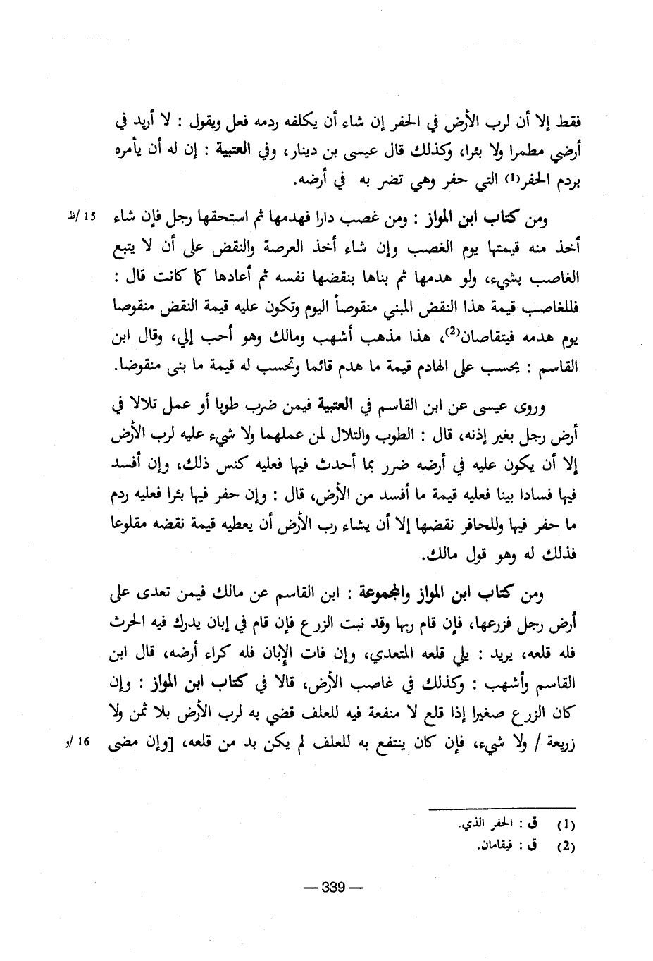 وروى عيسى عن ابن القاسم في العتبية فيمن ضرب طوبا أو عمل تلالا في أرض رجل بغير إذنه، قال: الطوب والتلال لمن عملهما ولا شيء عليه لرب الأرض إلا أن يكون عليه فعليه قيمة ما أفسد من الأرض، قال: وإن حفر فيها بئرا فعليه ردم ما حفر فيها وللحافر نقضها إلا أن يشاء رب الأرض أن يعطيه قيمة نقضه مقلوعا فذلك له وهو قول مالك.